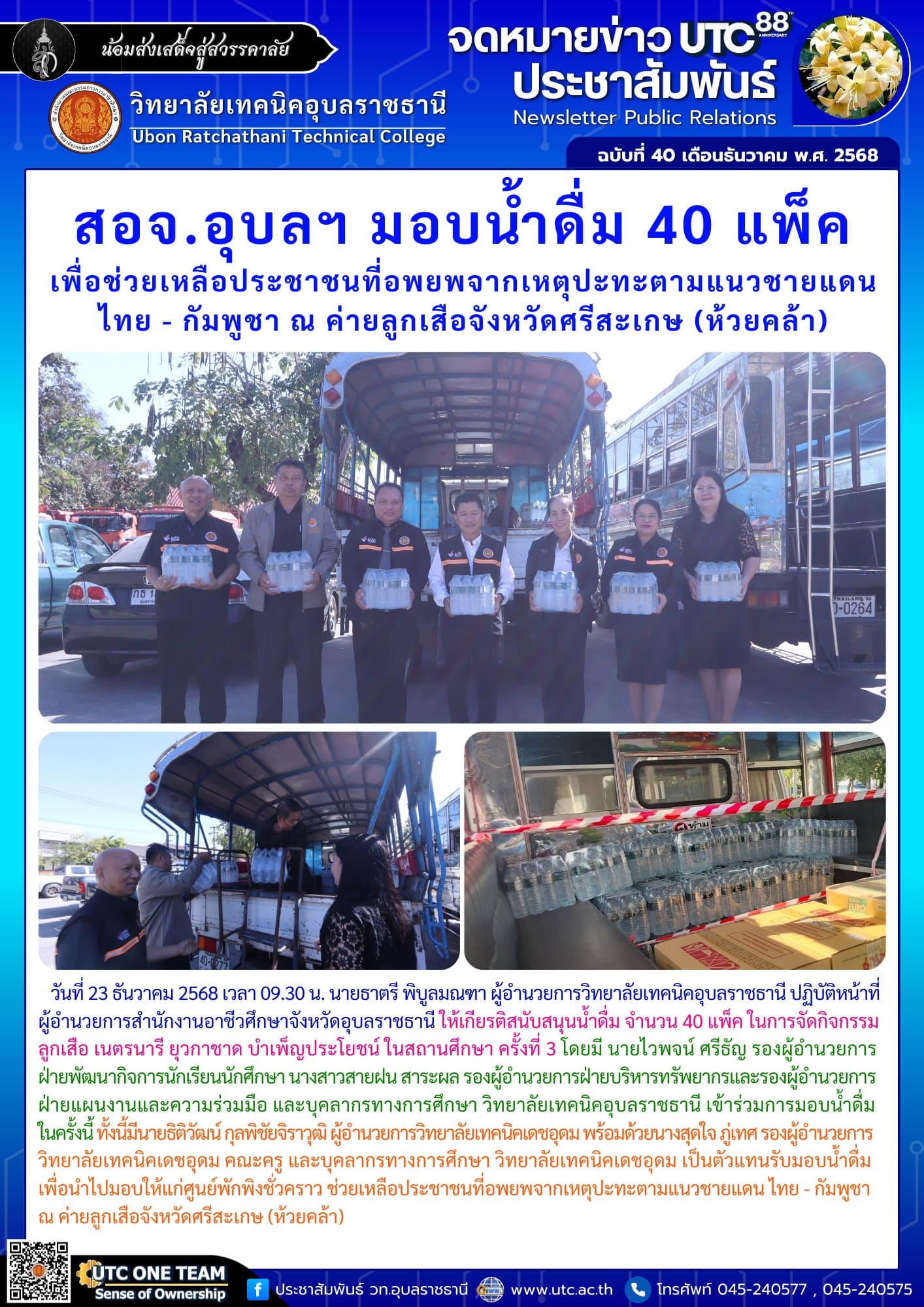 วันที่ 23 ธันวาคม 2568 เวลา 09.30 น. นายธาตรี พิบูลมณฑา ผู้อำนวยการวิทยาลัยเทคนิคอุบลราชธานี ปฏิบัติหน้าที่ ผู้อำนวยการสำนักงานอาชีวศึกษาจังหวัดอุบลราชธานี ให้เกียรติสนับสนุนน้ำดื่ม จำนวน 40 แพ็ค ในการจัดกิจกรรมลูกเสือ เนตรนารี ยุวกาชาด บำเพ็ญประโยชน์ ในสถานศึกษา ครั้งที่ 3 โดยมี นายไวพจน์ ศรีธัญ รองผู้อำนวยการฝ่ายพัฒนากิจการนักเรียนนักศึกษา นางสาวสายฝน สาระผล รองผู้อำนวยการฝ่ายบริหารทรัพยากรและรองผู้อำนวยการฝ่ายแผนงานและความร่วมมือ และบุคลากรทางการศึกษา วิทยาลัยเทคนิคอุบลราชธานี เข้าร่วมการมอบน้ำดื่มในครั้งนี้ทั้งนี้มีนายธิติวัฒน์ กุลพิชัยจิราวุฒิ ผู้อำนวยการวิทยาลัยเทคนิคเดชอุดม พร้อมด้วยนางสุดใจ ภู่เทศ รองผู้อำนวยการวิทยาลัยเทคนิคเดชอุดม คณะครู และบุคลากรทางการศึกษา วิทยาลัยเทคนิคเดชอุดม เป็นตัวแทนรับมอบน้ำดื่มเพื่อนำไปมอบให้แก่ศูนย์พักพิงชั่วคราว ช่วยเหลือประชาชนที่อพยพจากเหตุปะทะตามแนวชายแดน ไทย – กัมพูชา ณ ค่ายลูกเสือจังหวัดศรีสะเกษ (ห้วยคล้า)