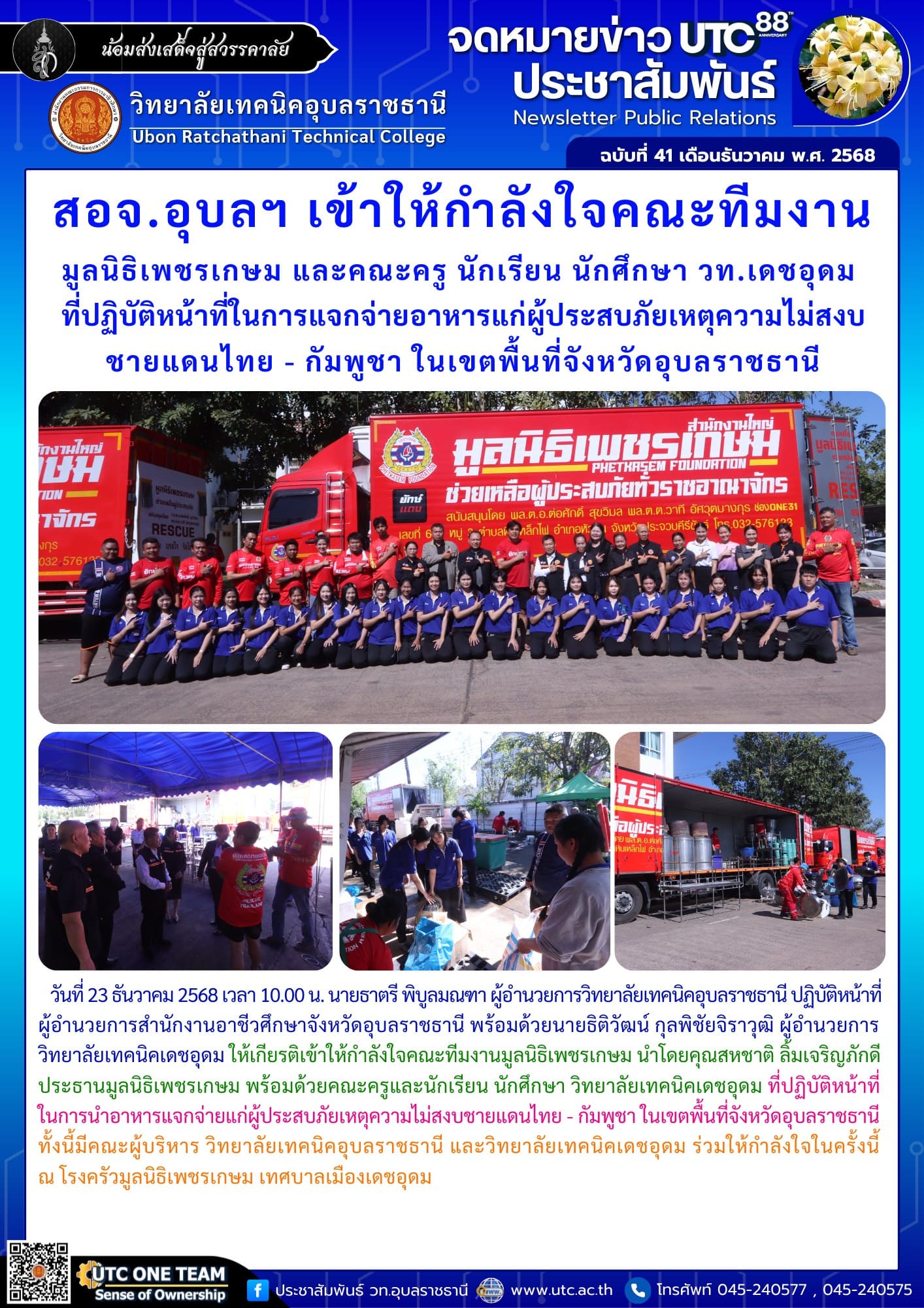 ปฏิบัติหน้าที่ ผู้อำนวยการสำนักงานอาชีวศึกษาจังหวัดอุบลราชธานี พร้อมด้วยนายธิติวัฒน์ กุลพิชัยจิราวุฒิ ผู้อำนวยการวิทยาลัยเทคนิคเดชอุดม ให้เกียรติเข้าให้กำลังใจคณะทีมงานมูลนิธิเพชรเกษม นำโดย คุณสหชาติ ลิ้มเจริญภักดี ประธานมูลนิธิเพชรเกษม พร้อมด้วยคณะครูและนักเรียน นักศึกษา วิทยาลัยเทคนิคเดชอุดม ที่ปฏิบัติหน้าที่ในการนำอาหารแจกจ่ายแก่ผู้ประสบภัยเหตุความไม่สงบชายแดนไทย – กัมพูชา ในเขตพื้นที่จังหวัดอุบลราชธานี ทั้งนี้มีคณะผู้บริหาร วิทยาลัยเทคนิคอุบลราชธานี และวิทยาลัยเทคนิคเดชอุดม ร่วมให้กำลังใจในครั้งนี้ ณ โรงครัวมูลนิธิเพชรเกษม เทศบาลเมืองเดชอุดม