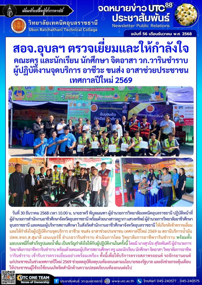สอจ.อุบลฯ ตรวจเยี่ยมและให้กำลังใจคณะครู และนักเรียน นักศึกษา จิตอาสา วิทยาลัยการอาชีพวารินชำราบ ผู้ปฏิบัติงานจุดบริการ อาชีวะ ขนส่ง อาสาช่วยประชาชน เทศกาลปีใหม่ 2569