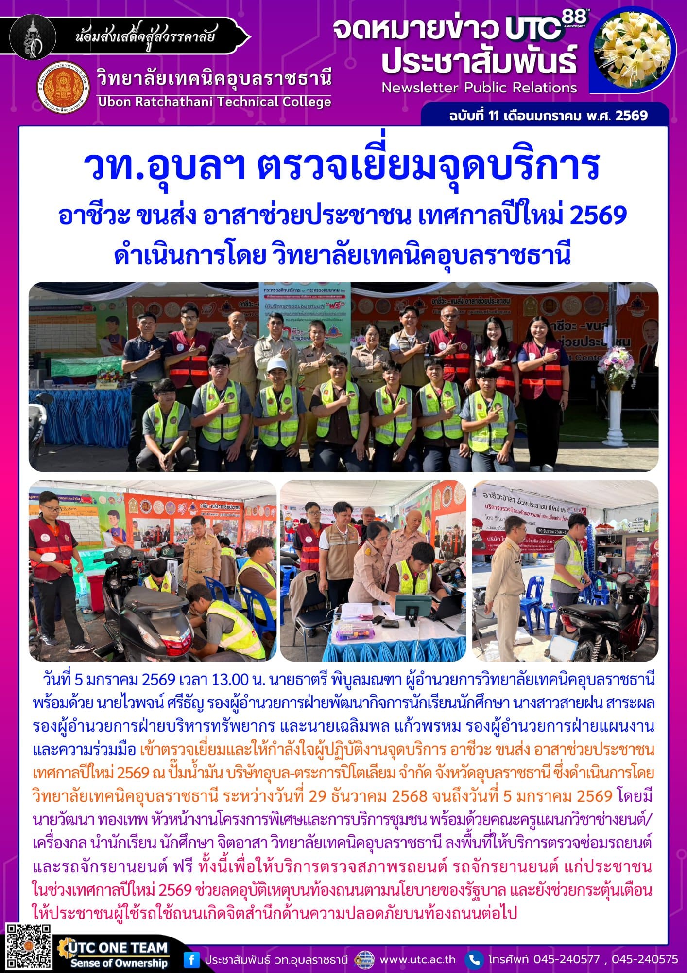 วันที่ 5 มกราคม 2569 เวลา 13.00 น. นายธาตรี พิบูลมณฑา ผู้อำนวยการวิทยาลัยเทคนิคอุบลราชธานี พร้อมด้วย นายไวพจน์ ศรีธัญ รองผู้อำนวยการฝ่ายพัฒนากิจการนักเรียนนักศึกษา นางสาวสายฝน สาระผล รองผู้อำนวยการฝ่ายบริหารทรัพยากร และนายเฉลิมพล แก้วพรหม รองผู้อำนวยการฝ่ายแผนงานและความร่วมมือ เข้าตรวจเยี่ยมและให้กำลังใจผู้ปฏิบัติงานจุดบริการ อาชีวะ ขนส่ง อาสาช่วยประชาชน เทศกาลปีใหม่ 2569 ณ ปั๊มน้ำมัน บริษัทอุบล-ตระการปิโตเลียม จำกัด จังหวัดอุบลราชธานี ซึ่งดำเนินการโดย วิทยาลัยเทคนิคอุบลราชธานี ระหว่างวันที่ 29 ธันวาคม 2568 จนถึงวันที่ 5 มกราคม 2569 โดยมี นายวัฒนา ทองเทพ หัวหน้างานโครงการพิเศษและการบริการชุมชน พร้อมด้วยคณะครูแผนกวิชาช่างยนต์/เครื่องกล นำนักเรียน นักศึกษา จิตอาสา วิทยาลัยเทคนิคอุบลราชธานี ลงพื้นที่ให้บริการตรวจซ่อมรถยนต์ และรถจักรยานยนต์ ฟรี ทั้งนี้เพื่อให้บริการตรวจสภาพรถยนต์ รถจักรยานยนต์ แก่ประชาชนในช่วงเทศกาลปีใหม่ 2569 ช่วยลดอุบัติเหตุบนท้องถนนตามนโยบายของรัฐบาล และยังช่วยกระตุ้นเตือนให้ประชาชนผู้ใช้รถใช้ถนนเกิดจิตสำนึกด้านความปลอดภัยบนท้องถนนต่อไป