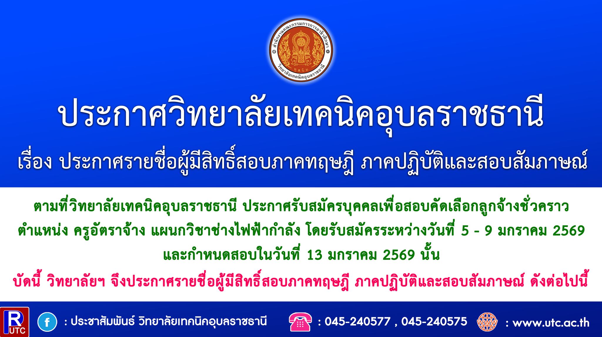 ตามที่วิทยาลัยเทคนิคอุบลราชธานี ประกาศรับสมัครบุคคลเพื่อสอบคัดเลือกลูกจ้างชั่วคราว ตำแหน่ง ครูอัตราจ้าง แผนกวิชาช่างไฟฟ้ากำลัง โดยรับสมัครระหว่างวันที่ 5 – 9 มกราคม 2569 และกำหนดสอบในวันที่ 13 มกราคม 2569 นั้น