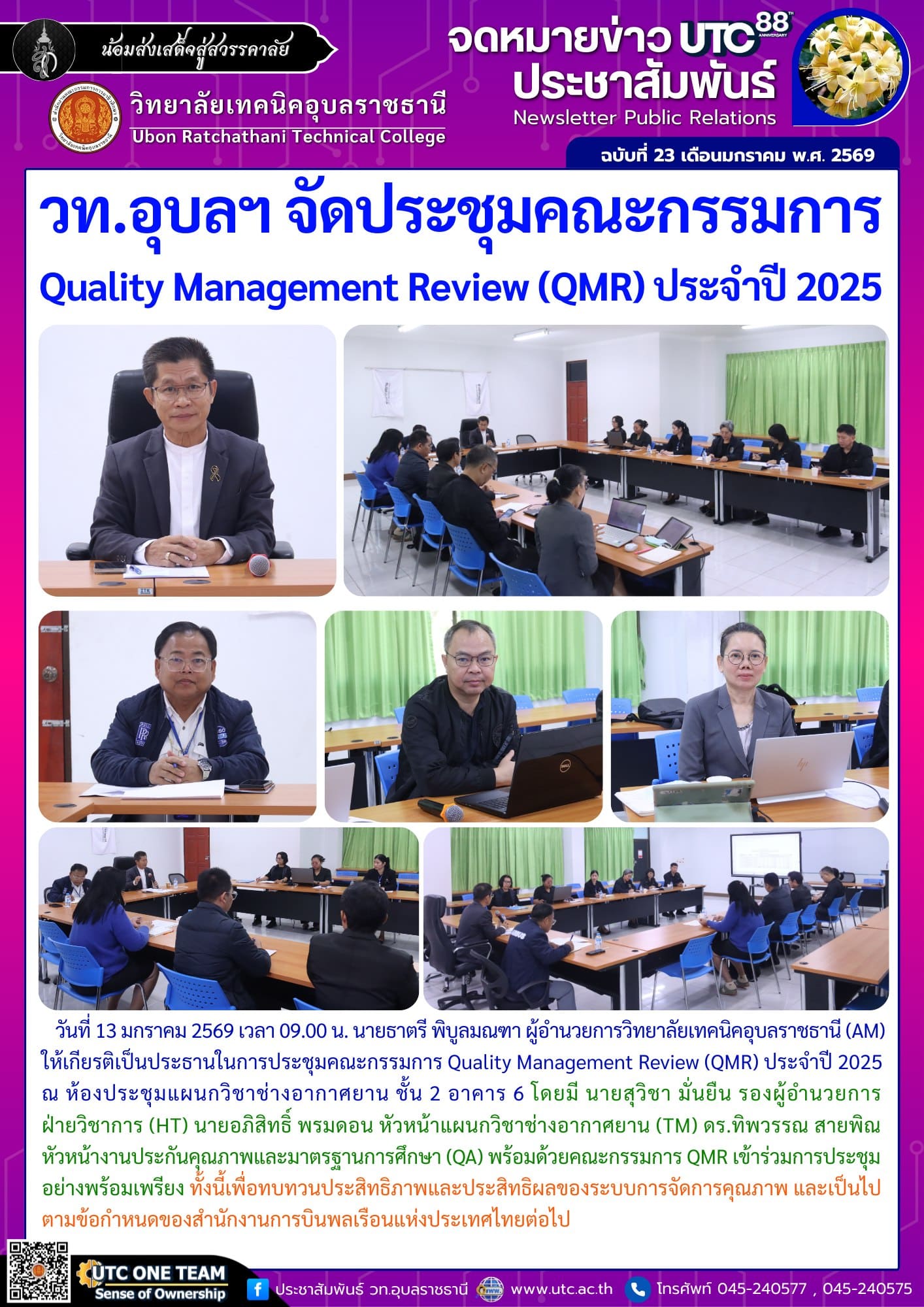 วันที่ 13 มกราคม 2569 เวลา 09.00 น. นายธาตรี พิบูลมณฑา ผู้อำนวยการวิทยาลัยเทคนิคอุบลราชธานี (AM) ให้เกียรติเป็นประธานในการประชุมคณะกรรมการ Quality Management Review (QMR) ประจำปี 2025 ณ ห้องประชุมแผนกวิชาช่างอากาศยาน ชั้น 2 อาคาร 6 โดยมี นายสุวิชา มั่นยืน รองผู้อำนวยการฝ่ายวิชาการ (HT) นายอภิสิทธิ์ พรมดอน หัวหน้าแผนกวิชาช่างอากาศยาน (TM) ดร.ทิพวรรณ สายพิณ หัวหน้างานประกันคุณภาพและมาตรฐานการศึกษา (QA) พร้อมด้วยคณะกรรมการ QMR เข้าร่วมการประชุมอย่างพร้อมเพรียง ทั้งนี้เพื่อทบทวนประสิทธิภาพและประสิทธิผลของระบบการจัดการคุณภาพ และเป็นไปตามข้อกำหนดของสำนักงานการบินพลเรือนแห่งประเทศไทยต่อไป