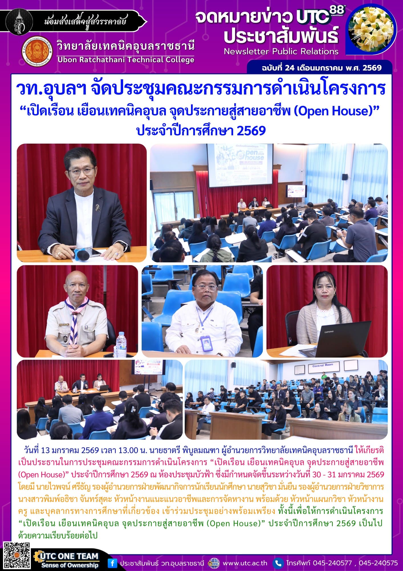 วันที่ 13 มกราคม 2569 เวลา 13.00 น. นายธาตรี พิบูลมณฑา ผู้อำนวยการวิทยาลัยเทคนิคอุบลราชธานี ให้เกียรติเป็นประธานในการประชุม คณะกรรมการดำเนินโครงการ “เปิดเรือน เยือนเทคนิคอุบล จุดประกายสู่สายอาชีพ (Open House)” ประจำปีการศึกษา 2569 ณ ห้องประชุมบัวฟ้า ซึ่งมีกำหนดจัดขึ้นระหว่างวันที่ 30 – 31 มกราคม 2569 โดยมี นายไวพจน์ ศรีธัญ รองผู้อำนวยการฝ่ายพัฒนากิจการนักเรียนนักศึกษา นายสุวิชา มั่นยืน รองผู้อำนวยการฝ่ายวิชาการ นางสาวพิมพ์อธิชา จันทร์สุตะ หัวหน้างานแนะแนวอาชีพและการจัดหางาน พร้อมด้วย หัวหน้าแผนกวิชา หัวหน้างาน ครู และบุคลากรทางการศึกษาที่เกี่ยวข้อง เข้าร่วมประชุมอย่างพร้อมเพรียง ทั้งนี้เพื่อให้การดำเนินโครงการ “เปิดเรือน เยือนเทคนิคอุบล จุดประกายสู่สายอาชีพ (Open House)” ประจำปีการศึกษา 2569 เป็นไปด้วยความเรียบร้อยต่อไป