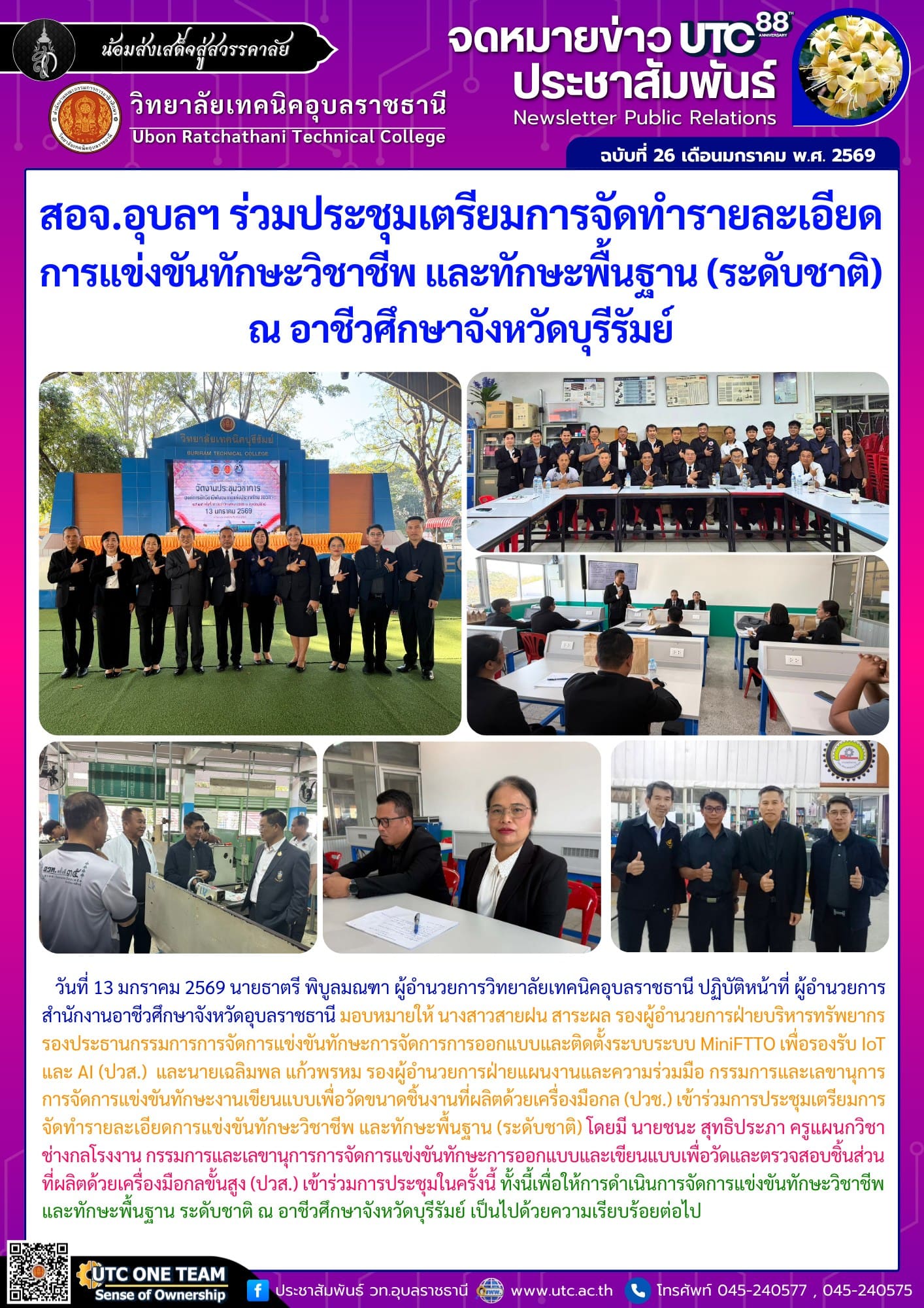 วันที่ 13 มกราคม 2569 นายธาตรี พิบูลมณฑา ผู้อำนวยการวิทยาลัยเทคนิคอุบลราชธานี ปฏิบัติหน้าที่ ผู้อำนวยการสำนักงานอาชีวศึกษา จังหวัดอุบลราชธานี มอบหมายให้ นางสาวสายฝน สาระผล รองผู้อำนวยการฝ่ายบริหารทรัพยากร รองประธานกรรมการการจัดการแข่งขันทักษะการจัดการการออกแบบและติดตั้งระบบระบบ MiniFTTO เพื่อรองรับ IoT และ AI (ปวส.) และนายเฉลิมพล แก้วพรหม รองผู้อำนวยการฝ่ายแผนงานและความร่วมมือ กรรมการและเลขานุการการจัดการแข่งขันทักษะงานเขียนแบบเพื่อวัดขนาดชิ้นงานที่ผลิตด้วยเครื่องมือกล (ปวช.) เข้าร่วมการประชุมเตรียมการจัดทำรายละเอียดการแข่งขันทักษะวิชาชีพ และทักษะพื้นฐาน (ระดับชาติ) โดยมี นายชนะ สุทธิประภา ครูแผนกวิชาช่างกลโรงงาน กรรมการและเลขานุการการจัดการแข่งขันทักษะการออกแบบและเขียนแบบเพื่อวัดและตรวจสอบชิ้นส่วนที่ผลิตด้วยเครื่องมือกลขั้นสูง (ปวส.) เข้าร่วมการประชุมในครั้งนี้ ทั้งนี้เพื่อให้การดำเนินการจัดการแข่งขันทักษะวิชาชีพ และทักษะพื้นฐาน ระดับชาติ ณ อาชีวศึกษาจังหวัดบุรีรัมย์ เป็นไปด้วยความเรียบร้อยต่อไป