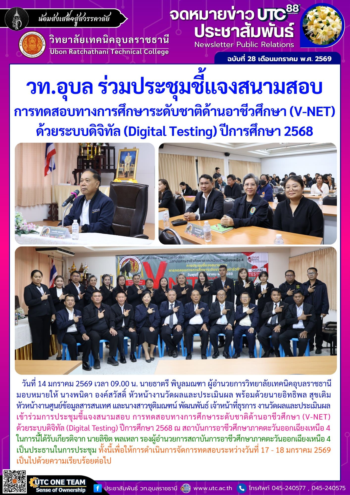 วันที่ 14 มกราคม 2569 เวลา 09.00 น. นายธาตรี พิบูลมณฑา ผู้อำนวยการวิทยาลัยเทคนิคอุบลราชธานี มอบหมายให้ นางพนิดา องค์สวัสดิ์ หัวหน้างานวัดผลและประเมินผล พร้อมด้วยนายอิทธิพล สุขเติม หัวหน้างานศูนย์ข้อมูลสารสนเทศ และนางสาวชุติมณฑน์ พัฒนพันธ์ เจ้าหน้าที่ธุรการ งานวัดผลและประเมินผล เข้าร่วมการประชุมชี้แจงสนามสอบ การทดสอบทางการศึกษาระดับชาติด้านอาชีวศึกษา (V-NET) ด้วยระบบดิจิทัล (Digital Testing) ปีการศึกษา 2568 ณ สถาบันการอาชีวศึกษาภาคตะวันออกเฉียงเหนือ 4 ในการนี้ได้รับเกียรติจาก นายลิขิต พลเหลา รองผู้อำนวยการสถาบันการอาชีวศึกษาภาคตะวันออกเฉียงเหนือ 4 เป็นประธานในการประชุม ทั้งนี้เพื่อให้การดำเนินการจัดการทดสอบระหว่างวันที่ 17 – 18 มกราคม 2569 เป็นไปด้วยความเรียบร้อยต่อไป