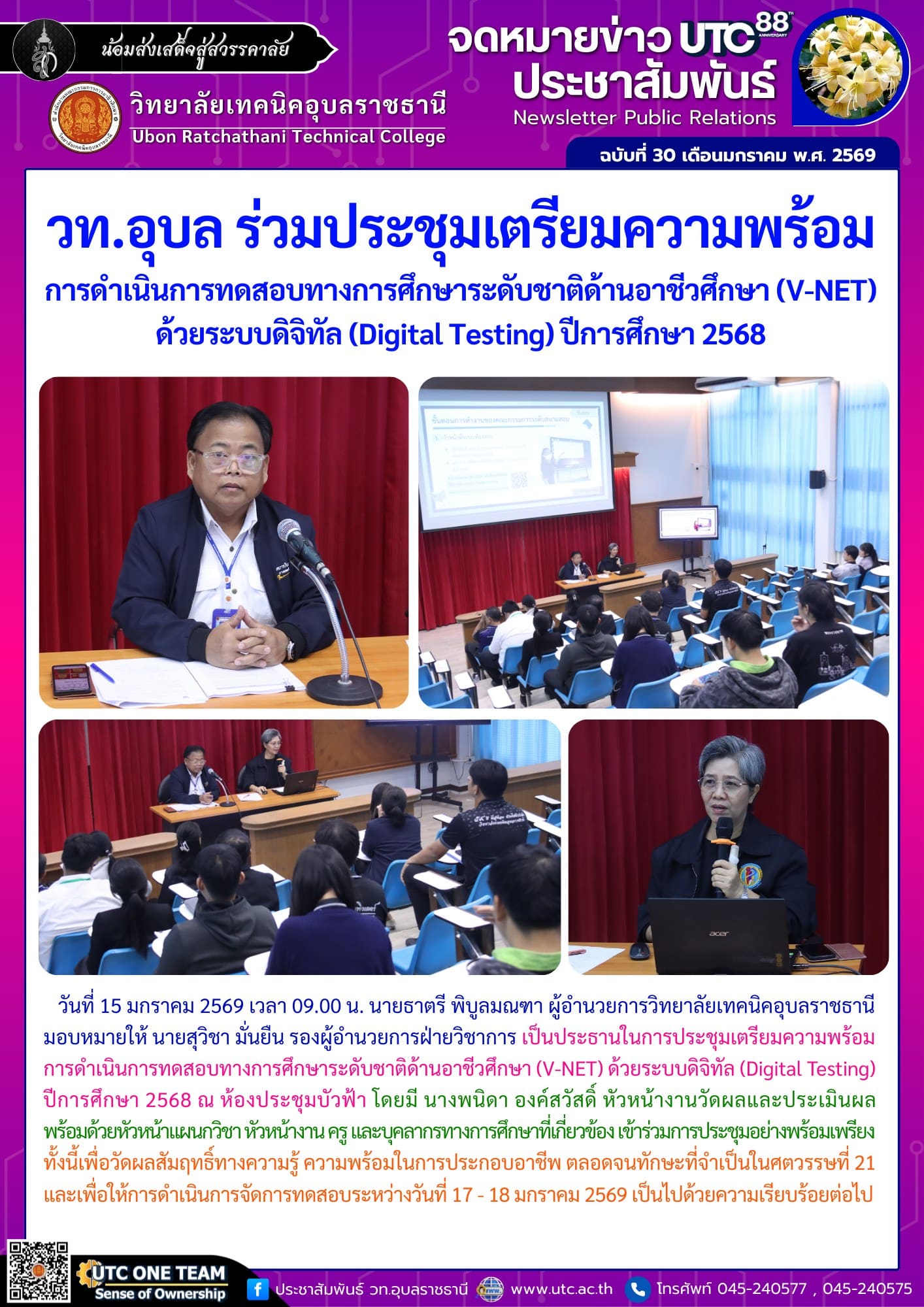 นที่ 15 มกราคม 2569 เวลา 09.00 น. นายธาตรี พิบูลมณฑา ผู้อำนวยการวิทยาลัยเทคนิคอุบลราชธานี มอบหมายให้ นายสุวิชา มั่นยืน รองผู้อำนวยการฝ่ายวิชาการ เป็นประธานในการประชุมเตรียมความพร้อมการดำเนินการทดสอบทางการศึกษาระดับชาติด้านอาชีวศึกษา (V-NET) ด้วยระบบดิจิทัล (Digital Testing) ปีการศึกษา 2568 ณ ห้องประชุมบัวฟ้า โดยมี นางพนิดา องค์สวัสดิ์ หัวหน้างานวัดผลและประเมินผล พร้อมด้วยหัวหน้าแผนกวิชา หัวหน้างาน ครู และบุคลากรทางการศึกษาที่เกี่ยวข้อง เข้าร่วมการประชุมอย่างพร้อมเพรียง ทั้งนี้เพื่อวัดผลสัมฤทธิ์ทางความรู้ ความพร้อมในการประกอบอาชีพ ตลอดจนทักษะที่จำเป็นในศตวรรษที่ 21 และเพื่อให้การดำเนินการจัดการทดสอบระหว่างวันที่ 17 – 18 มกราคม 2569 เป็นไปด้วยความเรียบร้อยต่อไป