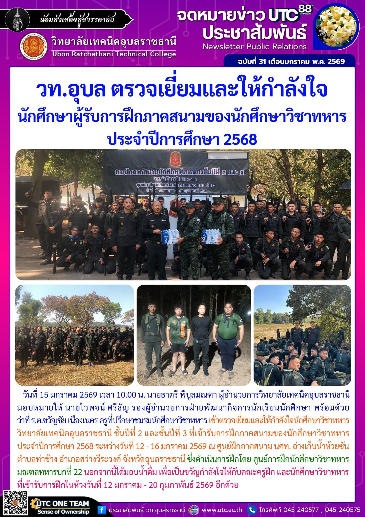 วันที่ 15 มกราคม 2569 เวลา 10.00 น. นายธาตรี พิบูลมณฑา ผู้อำนวยการวิทยาลัยเทคนิคอุบลราชธานี มอบหมายให้ นายไวพจน์ ศรีธัญ รองผู้อำนวยการฝ่ายพัฒนากิจการนักเรียนนักศึกษา พร้อมด้วยว่าที่ ร.ต.ขวัญชัย เนืองเนตร ครูที่ปรึกษาชมรมนักศึกษาวิชาทหาร เข้าตรวจเยี่ยมและให้กำลังใจนักศึกษาวิชาทหาร วิทยาลัยเทคนิคอุบลราชธานี ชั้นปีที่ 2 และชั้นปีที่ 3 ที่เข้ารับการฝึกภาคสนามของนักศึกษาวิชาทหาร ประจำปีการศึกษา 2568 ระหว่างวันที่ 12 – 16 มกราคม 2569 ณ ศูนย์ฝึกภาคสนามนศท.อ่างเก็บน้ำห้วยซัน ตำบลท่าช้าง อำเภอสว่างวีระวงศ์ จังหวัดอุบลราชธานี ซึ่งดำเนินการฝึกโดย ศูนย์การฝึกนักศึกษาวิชาทหาร มณฑลทหารบกที่ 22 นอกจากนี้ได้มอบน้ำดื่ม เพื่อเป็นขวัญกำลังใจให้กับคณะครูฝึก และนักศึกษาวิชาทหาร ที่เข้ารับการฝึกในห้วงวันที่ 12 มกราคม – 20 กุมภาพันธ์ 2569 อีกด้วย