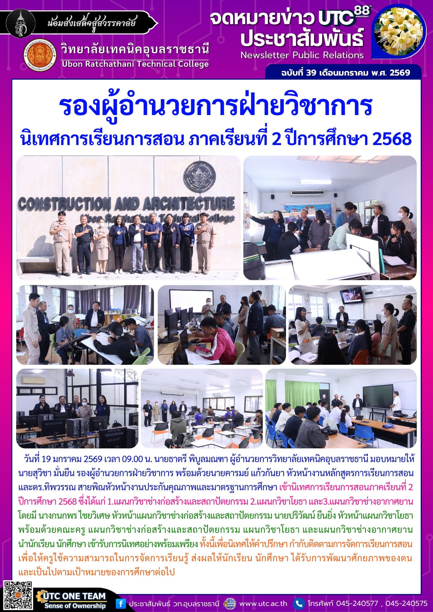 วันที่ 19 มกราคม 2569 เวลา 09.00 น. นายธาตรี พิบูลมณฑา ผู้อำนวยการวิทยาลัยเทคนิคอุบลราชธานี มอบหมายให้ นายสุวิชา มั่นยืน รองผู้อำนวยการฝ่ายวิชาการ พร้อมด้วยนายคารมย์ แก้วกันยา หัวหน้างานหลักสูตรการเรียนการสอน และดร.ทิพวรรณ สายพิณหัวหน้างานประกันคุณภาพและมาตรฐานการศึกษา เข้านิเทศการเรียนการสอนภาคเรียนที่ 2 ปีการศึกษา 2568 ซึ่งได้แก่ 1.แผนกวิชาช่างก่อสร้างและสถาปัตยกรรม 2.แผนกวิชาโยธา และ3.แผนกวิชาช่างอากาศยาน โดยมี นางกนกพร ไชยวิเศษ หัวหน้าแผนกวิชาช่างก่อสร้างและสถาปัตยกรรม นายปริวัฒน์ ยืนยิ่ง หัวหน้าแผนกวิชาโยธา พร้อมด้วยคณะครู แผนกวิชาช่างก่อสร้างและสถาปัตยกรรม แผนกวิชาโยธา และแผนกวิชาช่างอากาศยาน นำนักเรียน นักศึกษา เข้ารับการนิเทศอย่างพร้อมเพรียง ทั้งนี้เพื่อนิเทศให้คำปรึกษา กำกับติดตามการจัดการเรียนการสอน เพื่อให้ครูใช้ความสามารถในการจัดการเรียนรู้ ส่งผลให้นักเรียน นักศึกษา ได้รับการพัฒนาศักยภาพของตน และเป็นไปตามเป้าหมายของการศึกษาต่อไป