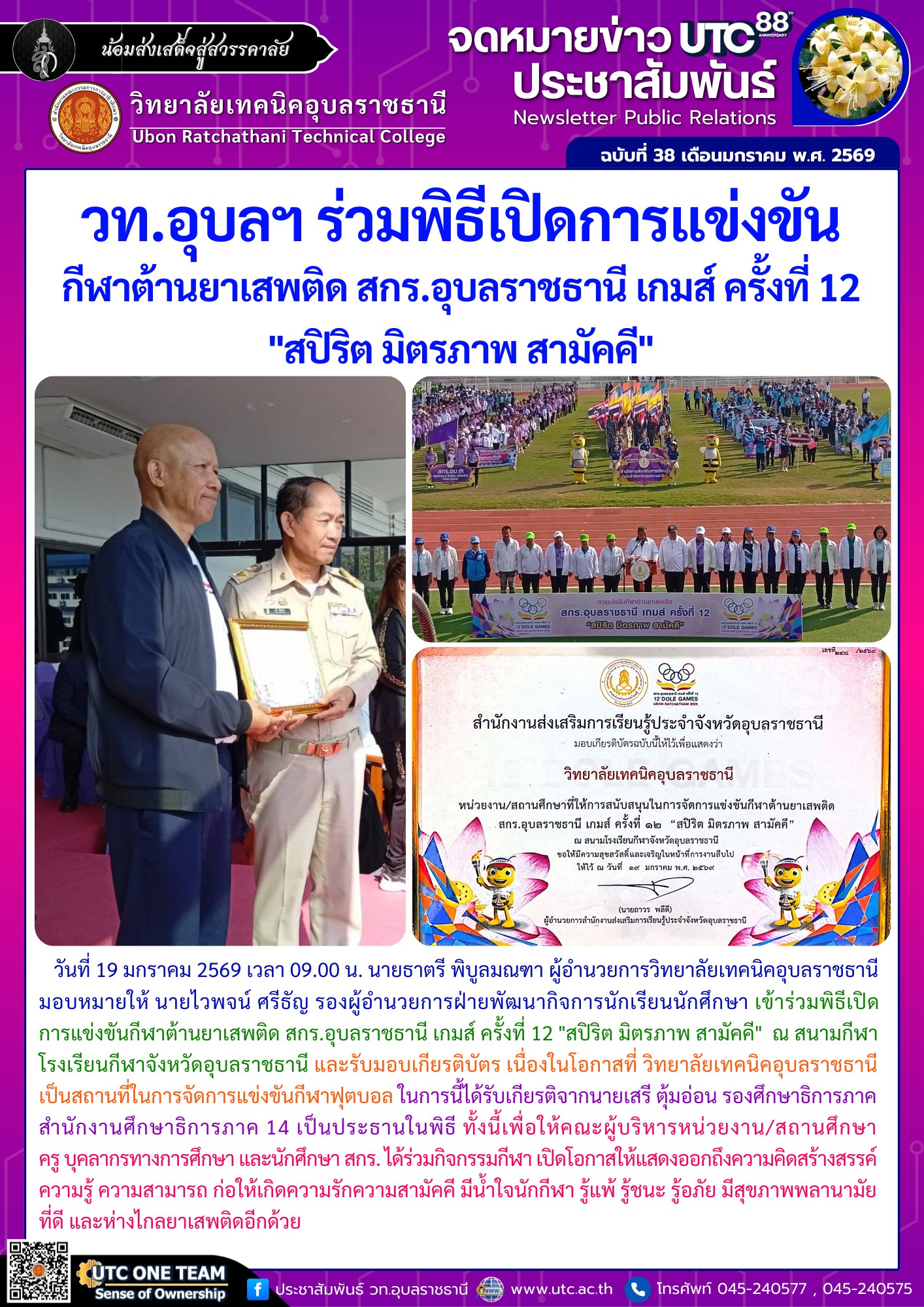 วันที่ 19 มกราคม 2569 เวลา 09.00 น. นายธาตรี พิบูลมณฑา ผู้อำนวยการวิทยาลัยเทคนิคอุบลราชธานี มอบหมายให้ นายไวพจน์ ศรีธัญ รองผู้อำนวยการฝ่ายพัฒนากิจการนักเรียนนักศึกษา เข้าร่วมพิธีเปิดการแข่งขันกีฬาต้านยาเสพติด สกร.อุบลราชธานี เกมส์ ครั้งที่ 12 “สปิริต มิตรภาพ สามัคคี” ณ สนามกีฬาโรงเรียนกีฬาจังหวัดอุบลราชธานี และรับมอบเกียรติบัตร เนื่องในโอกาสที่ วิทยาลัยเทคนิคอุบลราชธานี เป็นสถานที่ในการจัดการแข่งขันกีฬาฟุตบอล ในการนี้ได้รับเกียรติจากนายเสรี ตุ้มอ่อน รองศึกษาธิการภาค สำนักงานศึกษาธิการภาค 14 เป็นประธานในพิธี ทั้งนี้เพื่อให้คณะผู้บริหารหน่วยงาน/สถานศึกษา ครู บุคลากรทางการศึกษา และนักศึกษา สกร. ได้ร่วมกิจกรรมกีฬา เปิดโอกาสให้แสดงออกถึงความคิดสร้างสรรค์ ความรู้ ความสามารถ ก่อให้เกิดความรักความสามัคคี มีน้ำใจนักกีฬา รู้แพ้ รู้ชนะ รู้อภัย มีสุขภาพพลานามัยที่ดี และห่างไกลยาเสพติดอีกด้วย