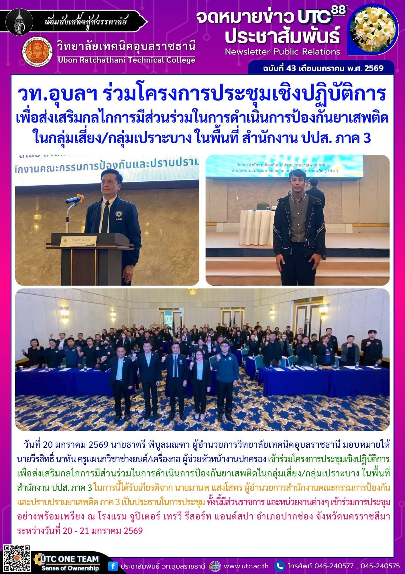 วันที่ 20 มกราคม 2569 นายธาตรี พิบูลมณฑา ผู้อำนวยการวิทยาลัยเทคนิคอุบลราชธานี มอบหมายให้ นายวีรสิทธิ์ นาทัน ครูแผนกวิชาช่างยนต์/เครื่องกล ผู้ช่วยหัวหน้างานปกครอง เข้าร่วมโครงการประชุมเชิงปฏิบัติการเพื่อส่งเสริมกลไกการมีส่วนร่วมในการดำเนินการป้องกันยาเสพติดในกลุ่มเสี่ยง/กลุ่มเปราะบาง ในพื้นที่สำนักงาน ปปส. ภาค 3 ในการนี้ได้รับเกียรติจาก นายมานพ แสงโสทร ผู้อำนวยการสำนักงานคณะกรรมการป้องกันและปราบปรามยาเสพติด ภาค 3 เป็นประธานในการประชุม ทั้งนี้มีส่วนราชการ และหน่วยงานต่างๆ เข้าร่วมการประชุมอย่างพร้อมเพรียง ณ โรงแรม จูปิเตอร์ เทรวี รีสอร์ท แอนด์สปา อำเภอปากช่อง จังหวัดนครราชสีมา ระหว่างวันที่ 20 – 21 มกราคม 2569