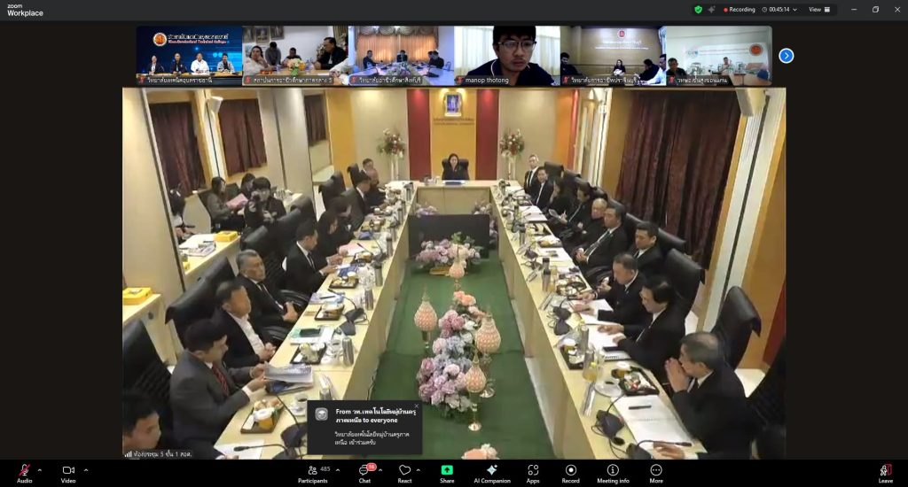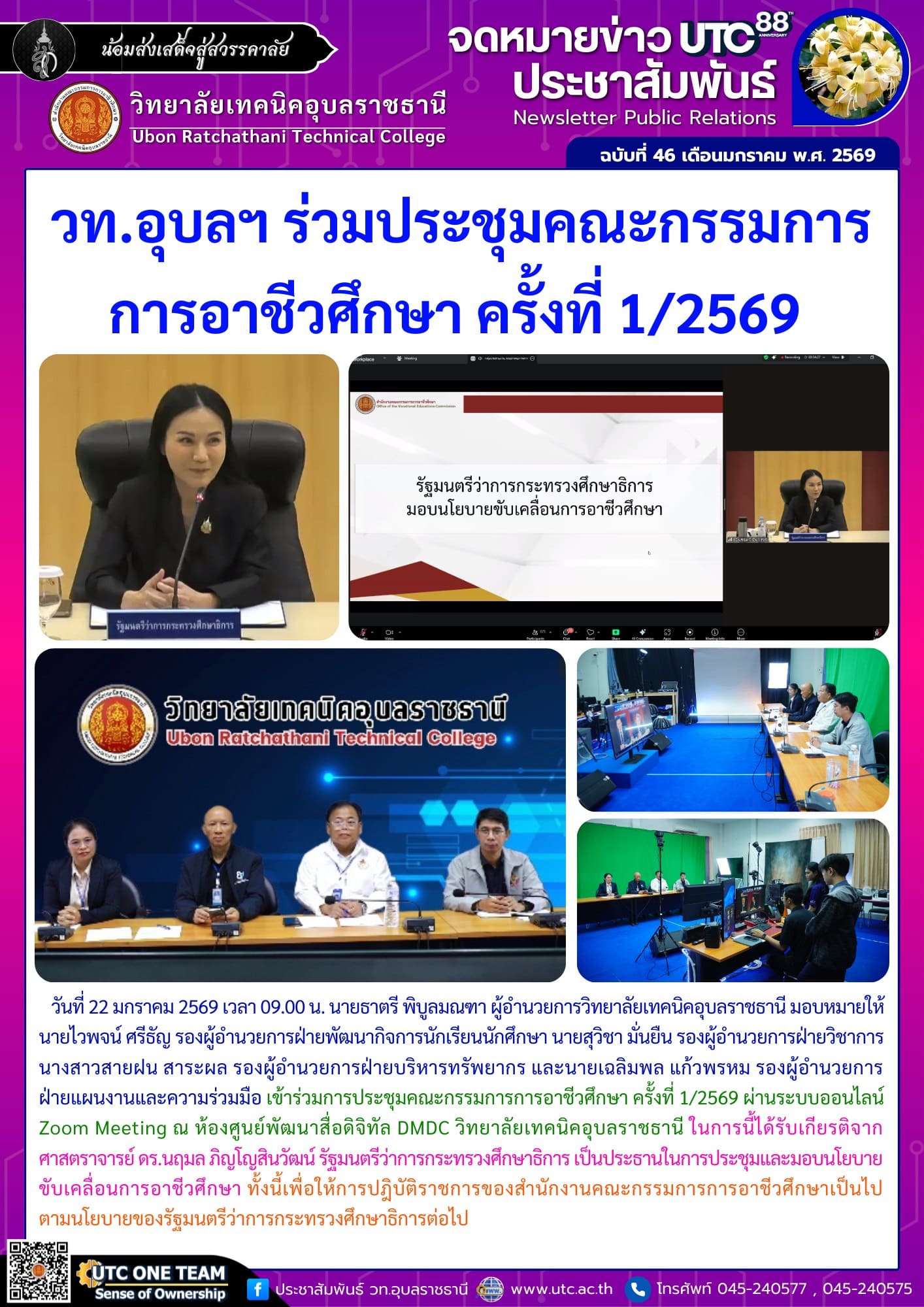 วันที่ 22 มกราคม 2569 เวลา 09.00 น. นายธาตรี พิบูลมณฑา ผู้อำนวยการวิทยาลัยเทคนิคอุบลราชธานี มอบหมายให้ นายไวพจน์ ศรีธัญ รองผู้อำนวยการฝ่ายพัฒนากิจการนักเรียนนักศึกษา นายสุวิชา มั่นยืน รองผู้อำนวยการฝ่ายวิชาการ นางสาวสายฝน สาระผล รองผู้อำนวยการฝ่ายบริหารทรัพยากร นายเฉลิมพล แก้วพรหม รองผู้อำนวยการฝ่ายแผนงานและความร่วมมือ เข้าร่วมประชุมคณะกรรมการการอาชีวศึกษา ครั้งที่ 1/2569 ผ่านระบบออนไลน์ Zoom Meeting ณ ห้องศูนย์พัฒนาสื่อดิจิทัล DMDC วิทยาลัยเทคนิคอุบลราชธานี ในการนี้ได้รับเกียรติจาก ศาสตราจารย์ ดร.นฤมล ภิญโญสินวัฒน์ รัฐมนตรีว่าการกระทรวงศึกษาธิการ เป็นประธานในการประชุมและมอบนโยบายขับเคลื่อนการอาชีวศึกษา ทั้งนี้เพื่อให้การปฎิบัติราชการของสำนักงานคณะกรรมการการอาชีวศึกษาเป็นไปตามนโยบายของรัฐมนตรีว่าการกระทรวงศึกษาธิการต่อไป