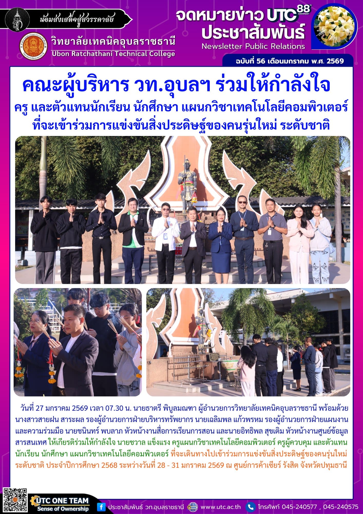 วันที่ 27 มกราคม 2569 เวลา 07.30 น. นายธาตรี พิบูลมณฑา ผู้อำนวยการวิทยาลัยเทคนิคอุบลราชธานี พร้อมด้วย นางสาวสายฝน สาระผล รองผู้อำนวยการฝ่ายบริหารทรัพยากร นายเฉลิมพล แก้วพรหม รองผู้อำนวยการฝ่ายแผนงานและความร่วมมือ นายชนินทร์ พบลาภ หัวหน้างานสื่อการเรียนการสอน และนายอิทธิพล สุขเติม หัวหน้างานศูนย์ข้อมูลสารสนเทศ ให้เกียรติร่วมให้กำลังใจ นายชวาล แข็งแรง ครูแผนกวิชาเทคโนโลยีคอมพิวเตอร์ ครูผู้ควบคุม และตัวแทนนักเรียน นักศึกษา แผนกวิชาเทคโนโลยีคอมพิวเตอร์ ที่จะเดินทางไปเข้าร่วมการแข่งขันสิ่งประดิษฐ์ของคนรุ่นใหม่ ระดับชาติ ประจำปีการศึกษา 2568 ระหว่างวันที่ 28 – 31 มกราคม 2569 ณ ศูนย์การค้าเซียร์ รังสิต จังหวัดปทุมธานี