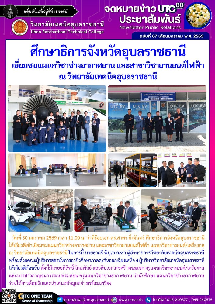 วันที่ 30 มกราคม 2569 เวลา 11.00 น. ว่าที่ร้อยเอก ดร.สาคร กิ่งจันทร์ ศึกษาธิการจังหวัดอุบลราชธานี ให้เกียรติเข้าเยี่ยมชมแผนกวิชาช่างอากาศยาน และสาขาวิชายานยนต์ไฟฟ้า แผนกวิชาช่างยนต์/เครื่องกล ณ วิทยาลัยเทคนิคอุบลราชธานี ในการนี้ นายธาตรี พิบูลมณฑา ผู้อำนวยการวิทยาลัยเทคนิคอุบลราชธานี พร้อมด้วยคณะผู้บริหารสถาบันการอาชีวศึกษาภาคตะวันออกเฉียงเหนือ 4 ผู้บริหารวิทยาลัยเทคนิคอุบลราชธานี ให้เกียรติต้อนรับ ทั้งนี้มีนายอภิสิทธิ์ โคนพันธ์ และสิบเอกเดชศรี พนมเขต ครูแผนกวิชาช่างยนต์/เครื่องกล และนางสาวกาญจนาวรรณ พรมสอน ครูแผนกวิชาช่างอากาศยาน นำนักศึกษา แผนกวิชาช่างอากาศยาน ร่วมให้การต้อนรับและนำเสนอข้อมูลอย่างพร้อมเพรียง