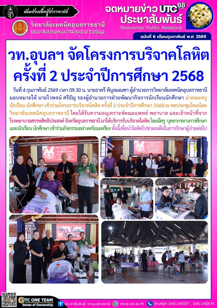 วันที่ 4 กุมภาพันธ์ 2569 เวลา 09.30 น. นายธาตรี พิบูลมณฑา ผู้อำนวยการวิทยาลัยเทคนิคอุบลราชธานี มอบหมายให้ นายไวพจน์ ศรีธัญ รองผู้อำนวยการฝ่ายพัฒนากิจการนักเรียนนักศึกษา นำคณะครู นักเรียน นักศึกษา เข้าร่วมโครงการบริจาคโลหิต ครั้งที่ 2 ประจำปีการศึกษา 2568 ณ หอประชุมโดมน้อย วิทยาลัยเทคนิคอุบลราชธานี โดยได้รับความอนุเคราะห์คณะแพทย์ พยาบาล และเจ้าหน้าที่จากโรงพยาบาลสรรพสิทธิประสงค์ จังหวัดอุบลราชธานี มาให้บริการรับบริจาคโลหิต โดยมีครู บุคลากรทางการศึกษา และนักเรียน นักศึกษา เข้าร่วมกิจกรรมอย่างพร้อมเพรียง ทั้งนี้เพื่อนำโลหิตไปช่วยเหลือในการรักษาผู้ป่วยต่อไป