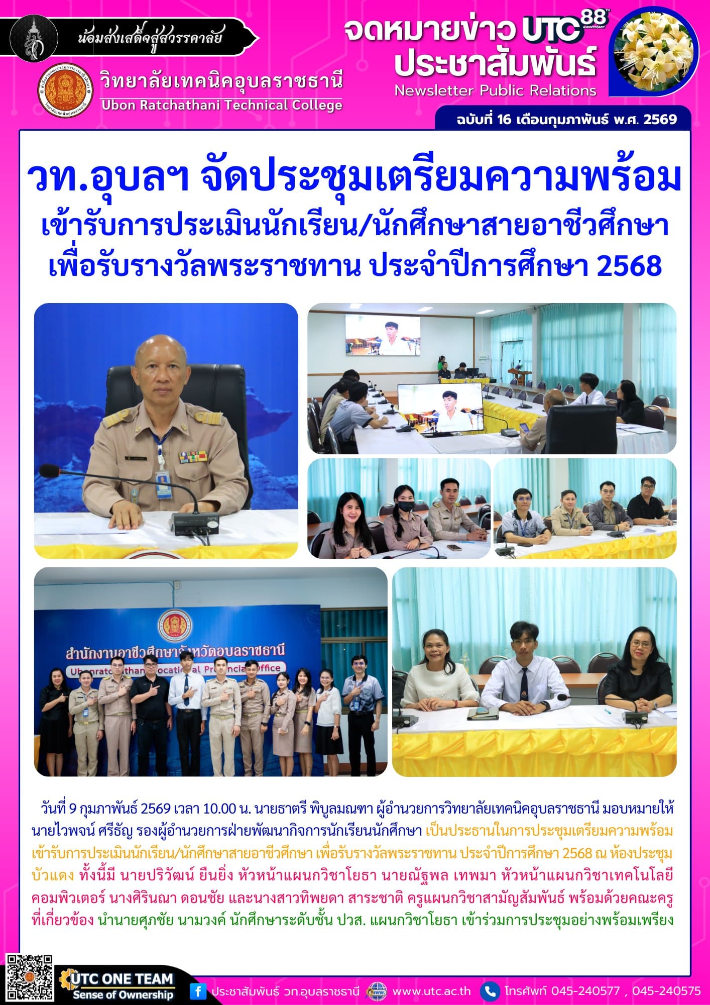 วันที่ 9 กุมภาพันธ์ 2569 เวลา 10.00 น. นายธาตรี พิบูลมณฑา ผู้อำนวยการวิทยาลัยเทคนิคอุบลราชธานีมอบหมายให้ นายไวพจน์ ศรีธัญ รองผู้ อำนวยการฝ่ายพัฒนากิจการนักเรียนนักศึกษา เป็นประธานในการประชุมเตรียมความพร้อมเข้ารับการประเมินนักเรียน/นักศึกษาสายอาชีวศึกษา เพื่อรับรางวัลพระราชทาน ประจำปีการศึกษา 2568 ณ ห้องประชุมบัวแดง ทั้งนี้มี นายปริวัฒน์ ยืนยิ่ง หัวหน้าแผนกวิชาโยธา นายณัฐพล เทพมา หัวหน้าแผนกวิชาเทคโนโลยีคอมพิวเตอร์ นางศิรินณา ดอนชัย และนางสาวทิพยดา สาระชาติ ครูแผนกวิชาสามัญสัมพันธ์ พร้อมด้วยคณะครูที่เกี่ยวข้อง นำนายศุภชัย นามวงค์ นักศึกษาระดับชั้น ปวส. แผนกวิชาโยธา เข้าร่วมการประชุมอย่างพร้อมเพรียง