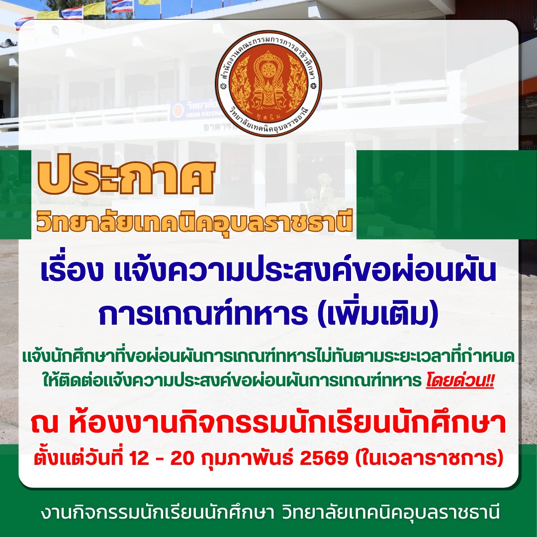 ประกาศวิทยาลัยเทคนิคอุบลราชธานี เรื่อง แจ้งความประสงค์ขอผ่อนผันการเกณฑ์ทหาร (เพิ่มเติม)
