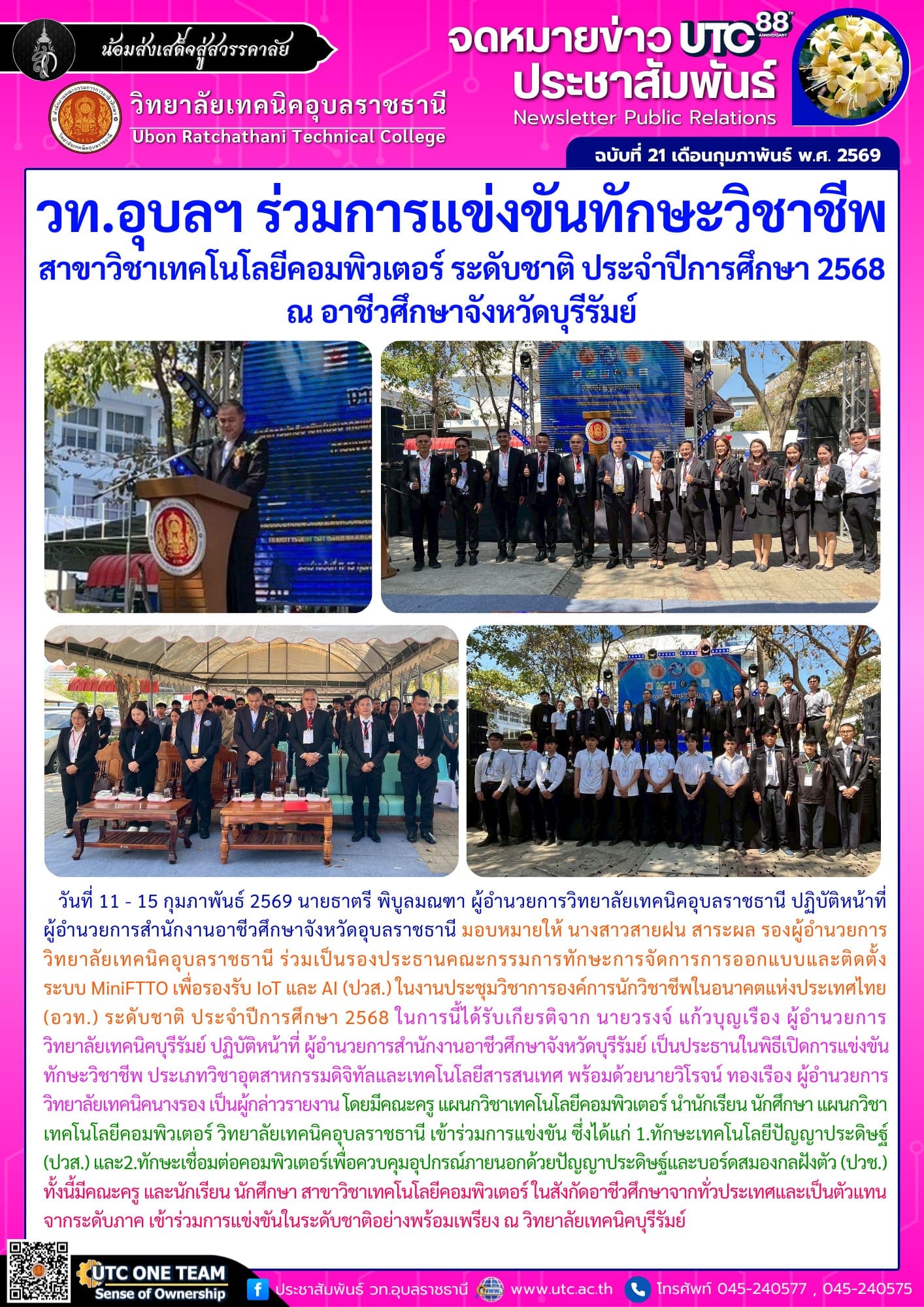 วันที่ 11 – 15 กุมภาพันธ์ 2569 นายธาตรี พิบูลมณฑา ผู้อำนวยการวิทยาลัยเทคนิคอุบลราชธานี ปฏิบัติหน้าที่ ผู้อำนวยการสำนักงาน อาชีวศึกษาจังหวัดอุบลราชธานี มอบหมายให้ นางสาวสายฝน สาระผล รองผู้อำนวยการวิทยาลัยเทคนิคอุบลราชธานี ร่วมเป็นรองประธานคณะกรรมการทักษะการจัดการการออกแบบและติดตั้งระบบ MiniFTTO เพื่อรองรับ IoT และ AI (ปวส.) ในงานประชุมวิชาการองค์การนักวิชาชีพในอนาคตแห่งประเทศไทย (อวท.) ระดับชาติ ประจำปีการศึกษา 2568 ในการนี้ได้รับเกียรติจาก นายวรงจ์ แก้วบุญเรือง ผู้อำนวยการวิทยาลัยเทคนิคบุรีรัมย์ ปฏิบัติหน้าที่ ผู้อำนวยการสำนักงานอาชีวศึกษาจังหวัดบุรีรัมย์ เป็นประธานในพิธีเปิดการแข่งขันทักษะวิชาชีพ ประเภทวิชาอุตสาหกรรมดิจิทัลและเทคโนโลยีสารสนเทศ พร้อมด้วยนายวิโรจน์ ทองเรือง ผู้อำนวยการวิทยาลัยเทคนิคนางรอง เป็นผู้กล่าวรายงาน โดยมีคณะครู แผนกวิชาเทคโนโลยีคอมพิวเตอร์ นำนักเรียน นักศึกษา แผนกวิชาเทคโนโลยีคอมพิวเตอร์ วิทยาลัยเทคนิคอุบลราชธานี เข้าร่วมการแข่งขัน ซึ่งได้แก่ 1.ทักษะเทคโนโลยีปัญญาประดิษฐ์ (ปวส.) และ2.ทักษะเชื่อมต่อคอมพิวเตอร์เพื่อควบคุมอุปกรณ์ภายนอกด้วยปัญญาประดิษฐ์และบอร์ดสมองกลฝังตัว (ปวช.) ทั้งนี้มีคณะครู และนักเรียน นักศึกษา สาขาวิชาเทคโนโลยีคอมพิวเตอร์ ในสังกัดอาชีวศึกษาจากทั่วประเทศและเป็นตัวแทนจากระดับภาค เข้าร่วมการแข่งขันในระดับชาติอย่างพร้อมเพรียง ณ วิทยาลัยเทคนิคบุรีรัมย์