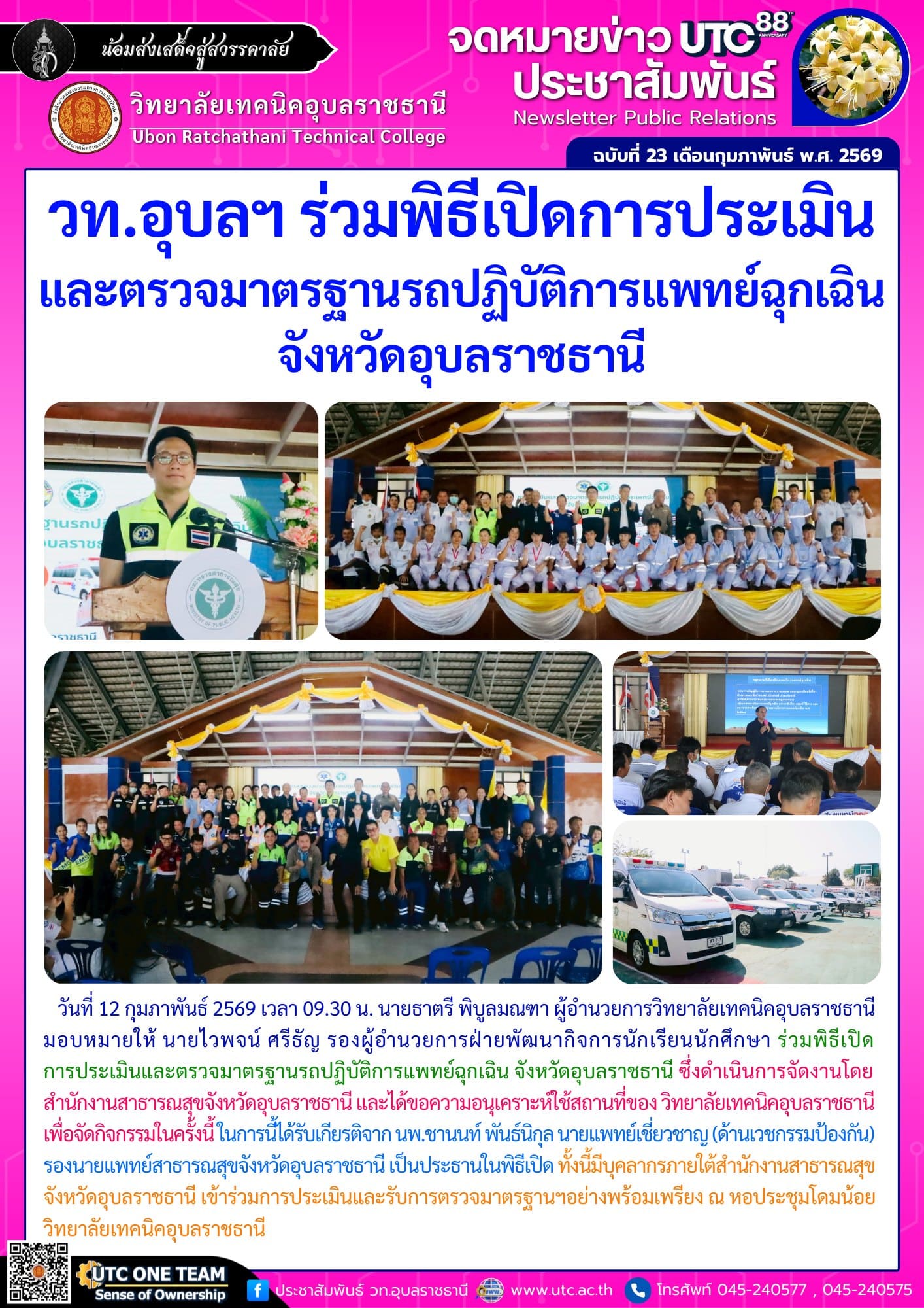 วันที่ 12 กุมภาพันธ์ 2569 เวลา 09.30 น. นายธาตรี พิบูลมณฑา ผู้อำนวยการวิทยาลัยเทคนิคอุบลราชธานี มอบหมายให้ นายไวพจน์ ศรีธัญ รองผู้อำนวยการฝ่ายพัฒนากิจการนักเรียน นักศึกษา ร่วมพิธีเปิดการประเมินและตรวจมาตรฐานรถปฏิบัติการแพทย์ฉุกเฉิน จังหวัดอุบลราชธานี ซึ่งดำเนินการจัดงานโดย สำนักงานสาธารณสุขจังหวัดอุบลราชธานี และได้ขอความอนุเคราะห์ใช้สถานที่ของ วิทยาลัยเทคนิคอุบลราชธานี เพื่อจัดกิจกรรมในครั้งนี้ ในการนี้ได้รับเกียรติจาก นพ.ชานนท์ พันธ์นิกุล นายแพทย์เชี่ยวชาญ (ด้านเวชกรรมป้องกัน) รองนายแพทย์สาธารณสุขจังหวัดอุบลราชธานี เป็นประธานในพิธีเปิด ทั้งนี้มีบุคลากรภายใต้สำนักงานสาธารณสุขจังหวัดอุบลราชธานี เข้าร่วมการประเมินอย่างพร้อมเพรียง ณ หอประชุมโดมน้อย วิทยาลัยเทคนิคอุบลราชธานี