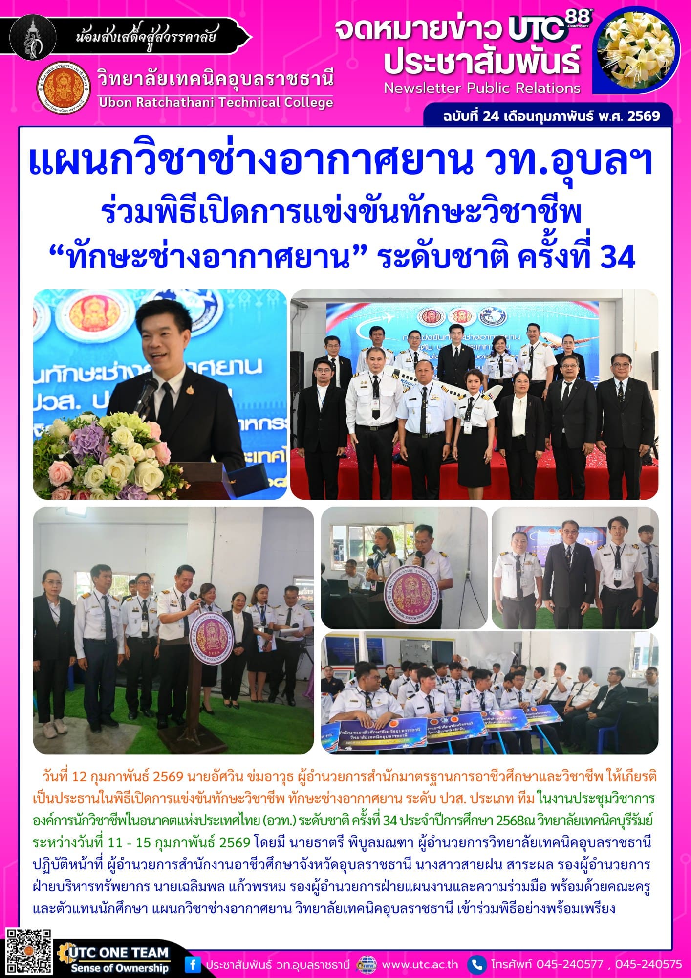 วันที่ 12 กุมภาพันธ์ 2569 นายอัศวิน ข่มอาวุธ ผู้อำนวยการสำนักมาตรฐานการอาชีวศึกษาและวิชาชีพ ให้เกียรติเป็นประธานในพิธีเปิดการแข่งขันทักษะวิชาชีพ ทักษะช่างอากาศยาน ระดับ ปวส. ประเภท ทีม ในงานประชุมวิชาการองค์การนักวิชาชีพในอนาคตแห่งประเทศไทย (อวท.) ระดับชาติ ครั้งที่ 34 ประจำปรการศึกษา 2568 ณ วิทยาลัยเทคนิคบุรีรัมย์ ระหว่างวันที่ 11 – 15 กุมภาพันธ์ 2569 โดยมี นายธาตรี พิบูลมณฑา ผู้อำนวยการวิทยาลัยเทคนิคอุบลราชธานี ปฏิบัติหน้าที่ ผู้อำนวยการสำนักงานอาชีวศึกษาจังหวัดอุบลราชธานี นางสาวสายฝน สาระผล รองผู้อำนวยการฝ่ายบริหารทรัพยากร นายเฉลิมพล แก้วพรหม รองผู้อำนวยการฝ่ายแผนงานและความร่วมมือ พร้อมด้วยคณะครู และตัวแทนนักศึกษา แผนกวิชาช่างอากาศยาน วิทยาลัยเทคนิคอุบลราชธานี เข้าร่วมพิธีอย่างพร้อมเพรียง