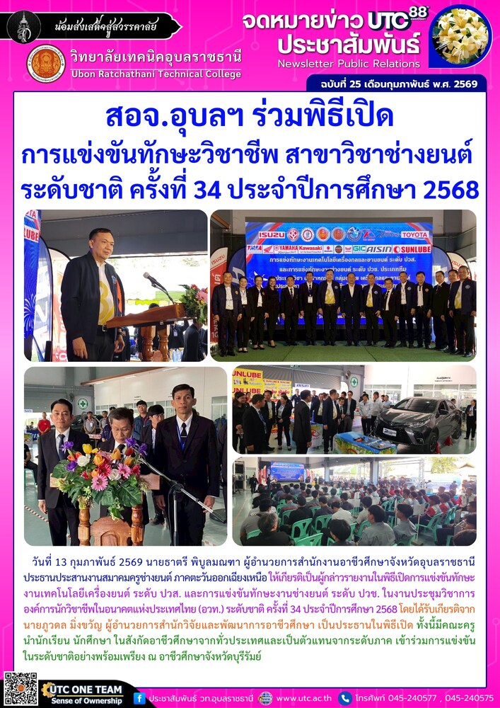วันที่ 13 กุมภาพันธ์ 2569 นายธาตรี พิบูลมณฑา ผู้อำนวยการสำนักงานอาชีวศึกษาจังหวัดอุบลราชธานี ประธานประสานงานสมาคมครูช่างยนต์ ภาคตะวันออกเฉียงเหนือ ให้เกียรติเป็นผู้กล่าวรายงานในพิธีเปิดการแข่งขันทักษะงานเทคโนโลยีเครื่องยนต์ ระดับ ปวส. และการแข่งขันทักษะงานช่างยนต์ ระดับ ปวช. ในงานประชุมวิชาการองค์การนักวิชาชีพในอนาคตแห่งประเทศไทย (อวท.) ระดับชาติ ครั้งที่ 34 ประจำปีการศึกษา 2568 โดยได้รับเกียรติจาก นายภูวดล มิ่งขวัญ ผู้อำนวยการสำนักวิจัยและพัฒนาการอาชีวศึกษา เป็นประธานในพิธีเปิด ทั้งนี้มีคณะครู นำนักเรียน นักศึกษา ในสังกัดอาชีวศึกษาจากทั่วประเทศและเป็นตัวแทนจากระดับภาค เข้าร่วมการแข่งขันในระดับชาติอย่างพร้อมเพรียง ณ อาชีวศึกษาจังหวัดบุรีรัมย์