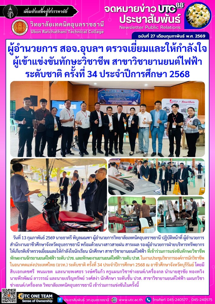 วันที่ 13 กุมภาพันธ์ 2569 นายธาตรี พิบูลมณฑา ผู้อำนวยการวิทยาลัยเทคนิคอุบลราชธานี ปฏิบัติหน้าที่ ผู้อำนวยการสำนักงานอาชีวศึกษาจังหวัดอุบลราชธานี พร้อมด้วยนางสาวสายฝน สาระผล รองผู้อำนวยการฝ่ายบริหารทรัพยากร ให้เกียรติเข้าตรวจเยี่ยมและให้กำลังใจนักเรียน นักศึกษา สาขาวิชายานยนต์ไฟฟ้า ที่เข้าร่วมการแข่งขันทักษะวิชาชีพ ทักษะงานจักรยานยนต์ไฟฟ้า ระดับ ปวช. และทักษะงานยานยนต์ไฟฟ้า ระดับ ปวส. ในงานประชุมวิชาการองค์การนักวิชาชีพในอนาคตแห่งประเทศไทย (อวท.) ระดับชาติ ครั้งที่ 34 ประจำปีการศึกษา 2568 ณ อาชีวศึกษาจังหวัดบุรีรัมย์ โดยมี สิบเอกเดชศรี พนมเขต และนายพงศธร วงษ์ศรีแก้ว ครูแผนกวิชาช่างยนต์/เครื่องกล นำนายสุรชัย ทองทวิง นายพีรพัฒน์ ลาวรรณ์ และนายเจริญทรัพย์ วงศ์สง่า นักศึกษาสาขาวิชายานยนต์ไฟฟ้า แผนกวิชาช่างยนต์/เครื่องกล วิทยาลัยเทคนิคอุบลราชธานี เข้าร่วมการแข่งขันในครั้งนี้