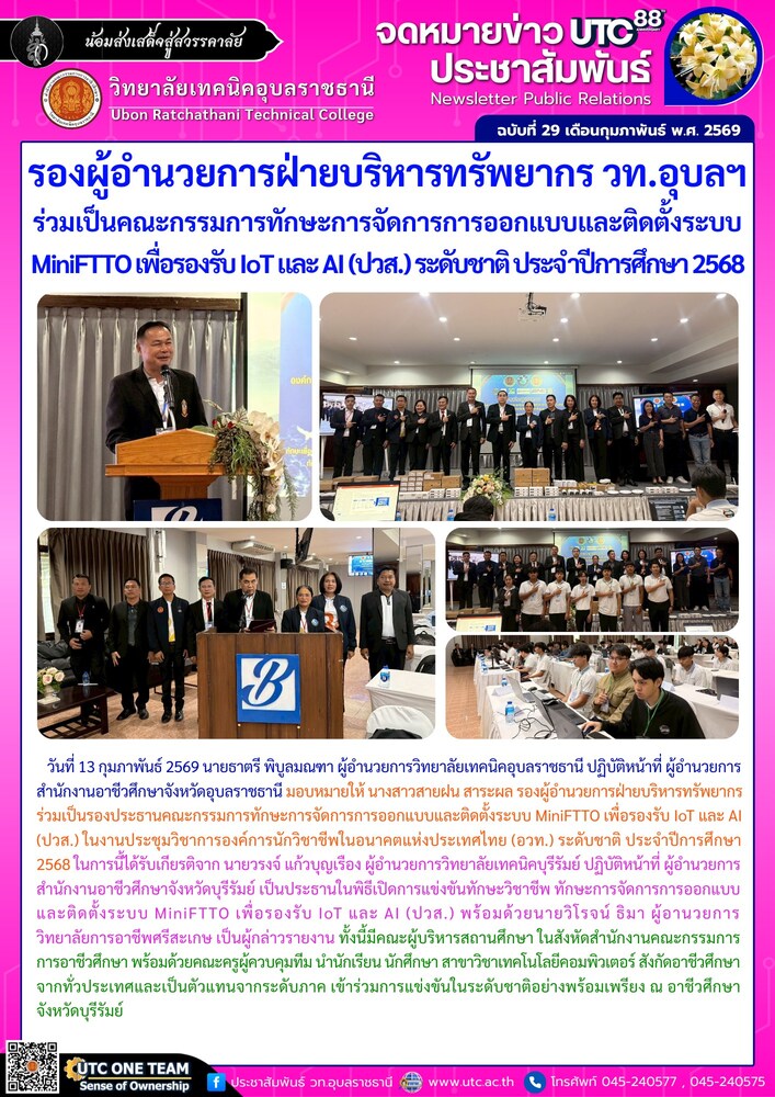 วันที่ 13 กุมภาพันธ์ 2569 นายธาตรี พิบูลมณฑา ผู้อำนวยการวิทยาลัยเทคนิคอุบลราชธานี ปฏิบัติหน้าที่ ผู้อำนวยการสำนักงานอาชีวศึกษาจังหวัดอุบลราชธานี มอบหมายให้ นางสาวสายฝน สาระผล รองผู้อำนวยการฝ่ายบริหารทรัพยากร ร่วมเป็นรองประธานคณะกรรมการทักษะการจัดการการออกแบบและติดตั้งระบบ MiniFTTO เพื่อรองรับ IoT และ AI (ปวส.) ในงานประชุมวิชาการองค์การนักวิชาชีพในอนาคตแห่งประเทศไทย (อวท.) ระดับชาติ ประจำปีการศึกษา 2568 ในการนี้ได้รับเกียรติจาก นายวรงจ์ แก้วบุญเรือง ผู้อำนวยการวิทยาลัยเทคนิคบุรีรัมย์ ปฏิบัติหน้าที่ ผู้อำนวยการสำนักงานอาชีวศึกษาจังหวัดบุรีรัมย์ เป็นประธานในพิธีเปิดการแข่งขันทักษะวิชาชีพ ทักษะการจัดการการออกแบบและติดตั้งระบบ MiniFTTO เพื่อรองรับ IoT และ AI (ปวส.) พร้อมด้วยนายวิโรจน์ ธิมา ผู้อานวยการวิทยาลัยการอาชีพศรีสะเกษ เป็นผู้กล่าวรายงาน ทั้งนี้มีคณะผู้บริหารสถานศึกษา ในสังหัดสำนักงานคณะกรรมการการอาชีวศึกษา พร้อมด้วยคณะครูผู้ควบคุมทีม นำนักเรียน นักศึกษา สาขาวิชาเทคโนโลยีคอมพิวเตอร์ สังกัดอาชีวศึกษาจากทั่วประเทศและเป็นตัวแทนจากระดับภาค เข้าร่วมการแข่งขันในระดับชาติอย่างพร้อมเพรียง ณ อาชีวศึกษาจังหวัดบุรีรัมย์