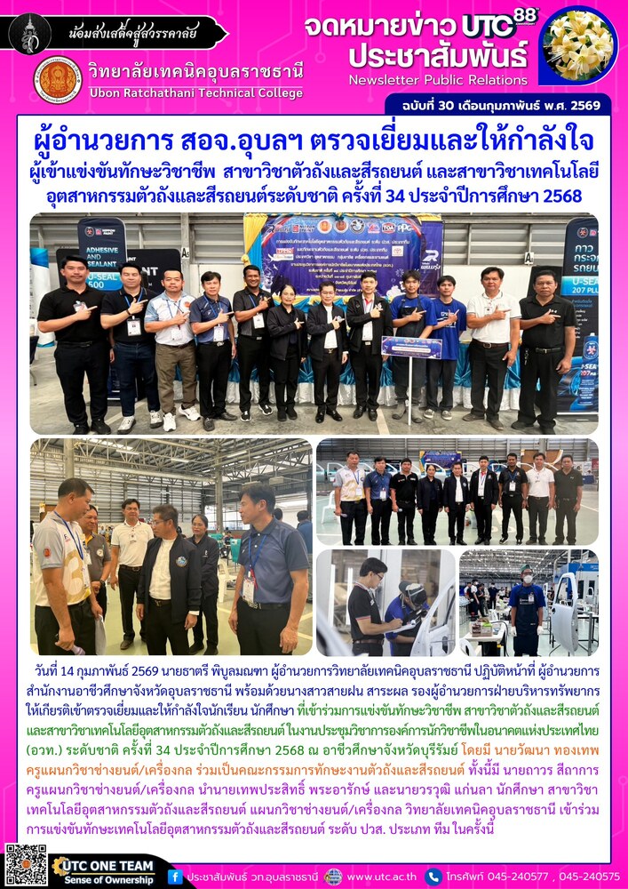 วันที่ 14 กุมภาพันธ์ 2569 นายธาตรี พิบูลมณฑา ผู้อำนวยการวิทยาลัยเทคนิคอุบลราชธานี ปฏิบัติหน้าที่ ผู้อำนวยการสำนักงานอาชีวศึกษาจังหวัดอุบลราชธานี พร้อมด้วยนางสาวสายฝน สาระผล รองผู้อำนวยการฝ่ายบริหารทรัพยากร ให้เกียรติเข้าตรวจเยี่ยมและให้กำลังใจนักเรียน นักศึกษา ที่เข้าร่วมการแข่งขันทักษะวิชาชีพ สาขาวิชาตัวถังและสีรถยนต์ และสาขาวิชาเทคโนโลยีอุตสาหกรรมตัวถังและสีรถยนต์ ในงานประชุมวิชาการองค์การนักวิชาชีพในอนาคตแห่งประเทศไทย (อวท.) ระดับชาติ ครั้งที่ 34 ประจำปีการศึกษา 2568 ณ อาชีวศึกษาจังหวัดบุรีรัมย์ โดยมี นายวัฒนา ทองเทพ ครูแผนกวิชาช่างยนต์/เครื่องกล ร่วมเป็นคณะกรรมการทักษะงานตัวถังและสีรถยนต์ ทั้งนี้มี นายถาวร สีถาการ ครูแผนกวิชาช่างยนต์/เครื่องกล นำนายเทพประสิทธิ์ พระอารักษ์ และนายวรวุฒิ แก่นลา นักศึกษา สาขาวิชาเทคโนโลยีอุตสาหกรรมตัวถังและสีรถยนต์ แผนกวิชาช่างยนต์/เครื่องกล วิทยาลัยเทคนิคอุบลราชธานี เข้าร่วมการแข่งขันทักษะเทคโนโลยีอุตสาหกรรมตัวถังและสีรถยนต์ ระดับ ปวส. ประเภท ทีม ในครั้งนี้