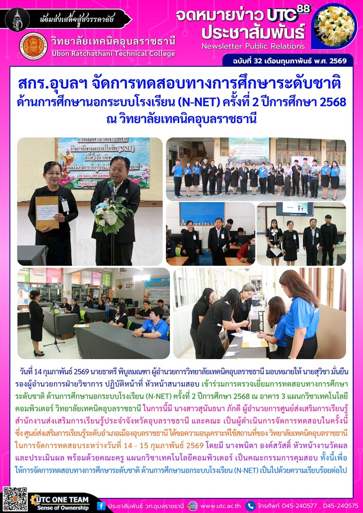 วันที่ 14 กุมภาพันธ์ 2569 นายธาตรี พิบูลมณฑา ผู้อำนวยการวิทยาลัยเทคนิคอุบลราชธานี มอบหมายให้ นายสุวิชา มั่นยืน รองผู้อำนวยการฝ่ายวิชาการ ปฏิบัติหน้าที่ หัวหน้าสนามสอบ เข้าร่วมการตรวจเยี่ยมการทดสอบทางการศึกษาระดับชาติ ด้านการศึกษานอกระบบโรงเรียน (N-NET) ครั้งที่ 2 ปีการศึกษา 2568 ณ อาคาร 3 แผนกวิชาเทคโนโลยีคอมพิวเตอร์ วิทยาลัยเทคนิคอุบลราชธานี ในการนี้มี นางสาวสุนันธนา ภักดี ผู้อำนวยการศูนย์ส่งเสริมการเรียนรู้ สำนักงานส่งเสริมการเรียนรู้ประจำจังหวัดอุบลราชธานี และคณะ เป็นผู้ดำเนินการจัดการทดสอบในครั้งนี้ ซึ่ง ศูนย์ส่งเสริมการเรียนรู้ระดับอำเภอเมืองอุบลราชธานี ได้ขอความอนุเคราะห์ใช้สถานที่ของ วิทยาลัยเทคนิคอุบลราชธานี ในการจัดการทดสอบระหว่างวันที่ 14 – 15 กุมภาพันธ์ 2569 โดยมี นางพนิดา องค์สวัสดิ์ หัวหน้างานวัดผลและประเมินผล พร้อมด้วยคณะครู แผนกวิชาเทคโนโลยีคอมพิวเตอร์ เป็นคณะกรรมการคุมสอบ ทั้งนี้เพื่อให้การจัดการทดสอบทางการศึกษาระดับชาติ ด้านการศึกษานอกระบบโรงเรียน (N-NET) เป็นไปด้วยความเรียบร้อยต่อไป