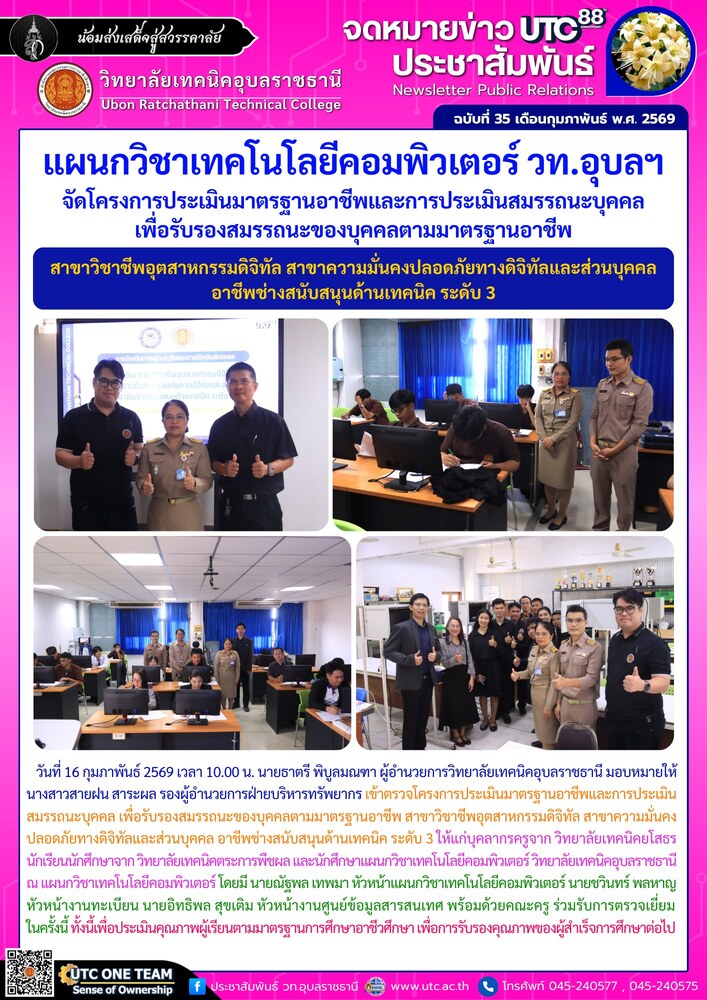 วันที่ 16 กุมภาพันธ์ 2569 เวลา 10.00 น. นายธาตรี พิบูลมณฑา ผู้อำนวยการวิทยาลัยเทคนิคอุบลราชธานี มอบหมายให้ นางสาวสายฝน สาระผล รองผู้อำนวยการฝ่ายบริหารทรัพยากร เข้าตรวจโครงการประเมินมาตรฐานอาชีพและการประเมินสมรรถนะบุคคล เพื่อรับรองสมรรถนะของบุคคลตามมาตรฐานอาชีพ สาขาวิชาชีพอุตสาหกรรมดิจิทัล สาขาความมั่นคงปลอดภัยทางดิจิทัลและส่วนบุคคล อาชีพช่างสนับสนุนด้านเทคนิค ระดับ 3 ให้แก่บุคลากรครูจาก วิทยาลัยเทคนิคยโสธร นักเรียนนักศึกษาจาก วิทยาลัยเทคนิคตระการพืชผล และนักศึกษาแผนกวิชาเทคโนโลยีคอมพิวเตอร์ วิทยาลัยเทคนิคอุบลราชธานี ณ แผนกวิชาเทคโนโลยีคอมพิวเตอร์ โดยมี นายณัฐพล เทพมา หัวหน้าแผนกวิชาเทคโนโลยีคอมพิวเตอร์ นายชวินทร์ พลหาญ หัวหน้างานทะเบียน นายอิทธิพล สุขเติม หัวหน้างานศูนย์ข้อมูลสารสนเทศ พร้อมด้วยคณะครู ร่วมรับการตรวจเยี่ยมในครั้งนี้ ทั้งนี้เพื่อประเมินคุณภาพผู้เรียนตามมาตรฐานการศึกษาอาชีวศึกษา เพื่อการรับรองคุณภาพของผู้สำเร็จการศึกษาต่อไป