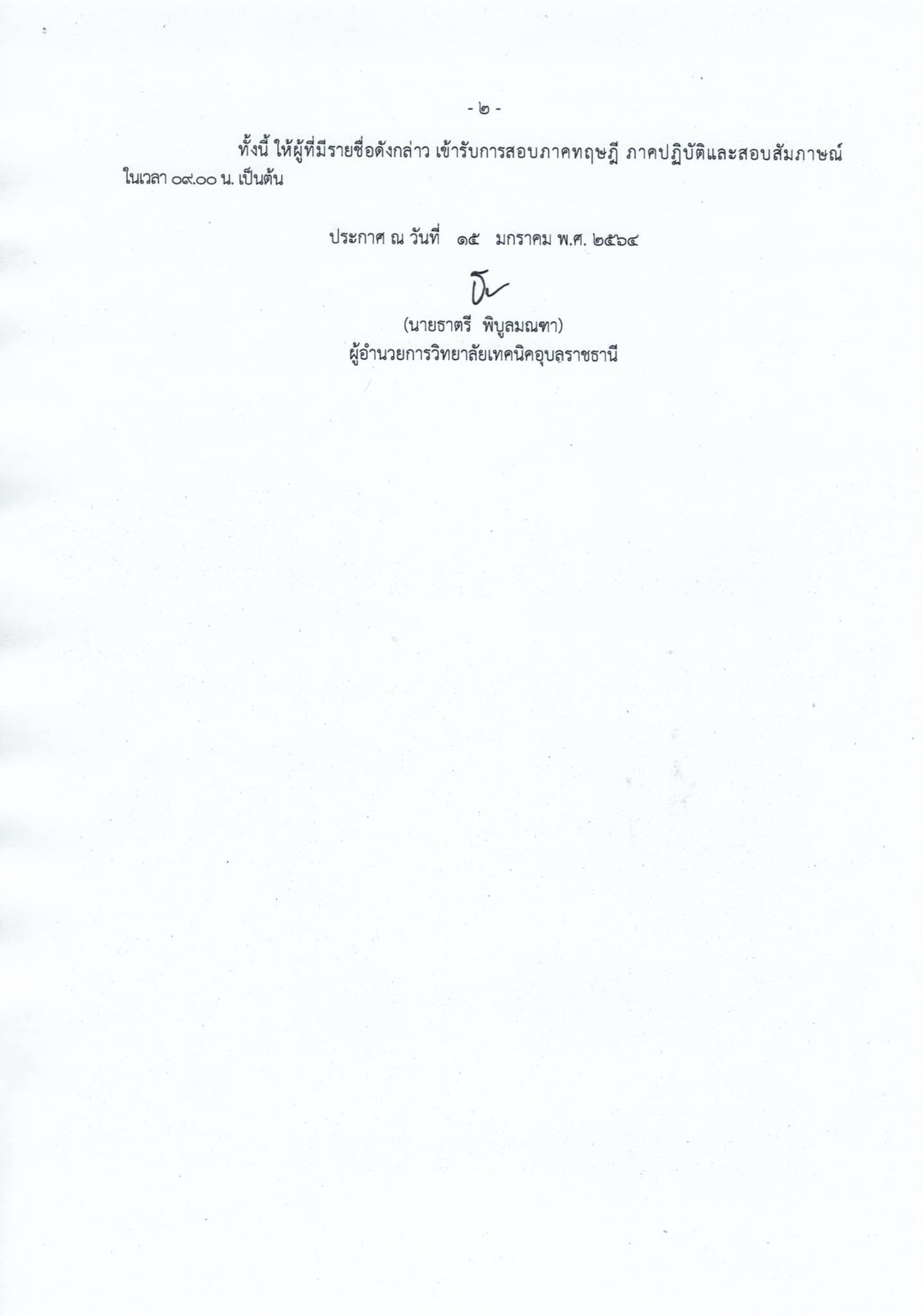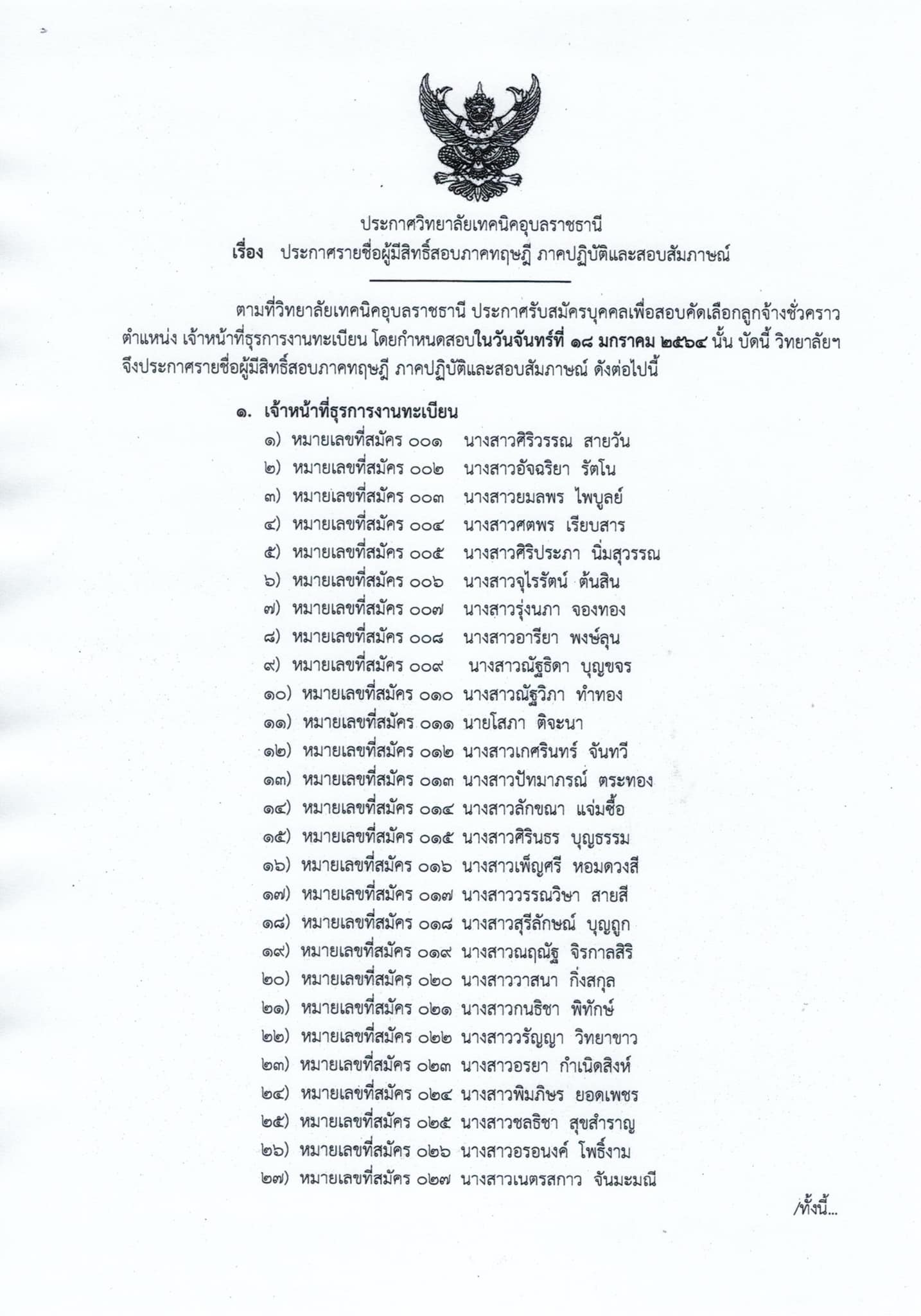 ประกาศรายชื่อผู้มีสิทธิ์สอบภาคทฤษฎี ภาคปฏิบัติและสอบสัมภาษณ์ ตำแหน่ง เจ้าหน้าที่ธุรการงานทะเบียน โดยกำหนดสอบในวันจันทร์ที่ ๑๘ มกราคม ๒๕๖๔ ในเวลา ๐๙.๐๐ น. ตามรูปภาพที่แนบ