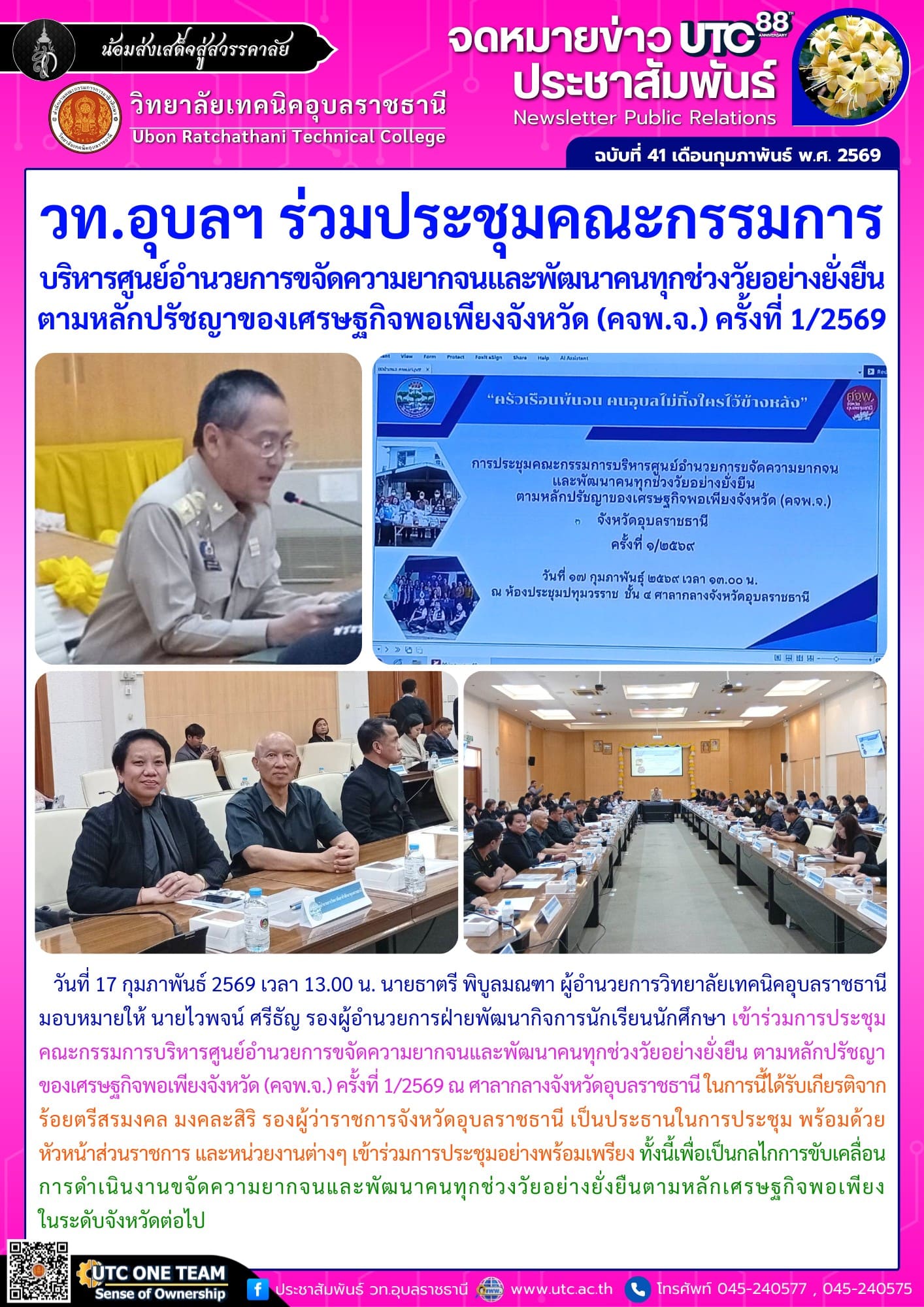 วันที่ 17 กุมภาพันธ์ 2569 เวลา 13.00 น. นายธาตรี พิบูลมณฑา ผู้อำนวยการวิทยาลัยเทคนิคอุบลราชธานี มอบหมายให้ นายไวพจน์ ศรีธัญ รองผู้อำนวยการฝ่ายพัฒนากิจการนักเรียนนักศึกษา เข้าร่วมการประชุมคณะกรรมการบริหารศูนย์อำนวยการขจัดความยากจนและพัฒนาคนทุกช่วงวัยอย่างยั่งยืน ตามหลักปรัชญาของเศรษฐกิจพอเพียงจังหวัด (คจพ.จ.) ครั้งที่ 1/2569 ณ ศาลากลางจังหวัดอุบลราชธานี ในการนี้ได้รับเกียรติจาก ร้อยตรีสรมงคล มงคละสิริ รองผู้ว่าราชการจังหวัดอุบลราชธานี เป็นประธานในการประชุม พร้อมด้วยมีหัวหน้าส่วนราชการ และหน่วยงานต่างๆ เข้าร่วมการประชุมอย่างพร้อมเพรียง ทั้งนี้เพื่อเป็นกลไกการขับเคลื่อนการดำเนินงานขจัดความยากจนและพัฒนาคนทุกช่วงวัยอย่างยั่งยืนตามหลักเศรษฐกิจพอเพียงในระดับจังหวัดต่อไป