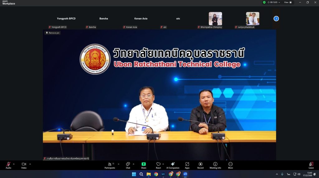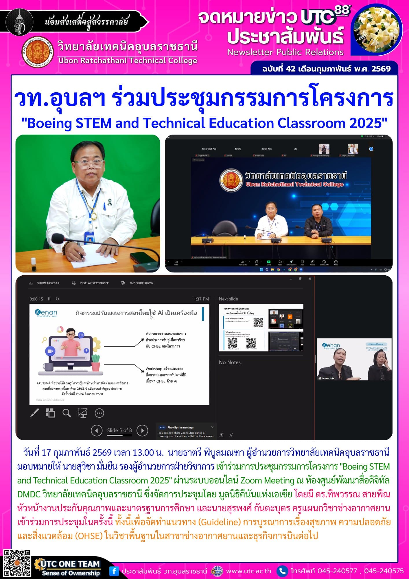วันที่ 17 กุมภาพันธ์ 2569 เวลา 13.00 น. นายธาตรี พิบูลมณฑา ผู้อำนวยการวิทยาลัยเทคนิคอุบลราชธานี มอบหมายให้ นายสุวิชา มั่นยืน รองผู้อำนวยการฝ่ายวิชาการ เข้าร่วมการประชุมกรรมการโครงการ “Boeing STEM and Technical Education Classroom 2025” ผ่านระบบออนไลน์ Zoom Meeting ณ ห้องศูนย์พัฒนาสื่อดิจิทัล DMDC วิทยาลัยเทคนิคอุบลราชธานี ซึ่งจัดการประชุมโดย มูลนิธิคีนันแห่งเอเซีย โดยมี ดร.ทิพวรรณ สายพิณหัวหน้างานประกันคุณภาพและมาตรฐานการศึกษา และนายสุรพงศ์ กันตะบุตร ครูแผนกวิชาช่างอากาศยาน เข้าร่วมการประชุมในครั้งนี้ ทั้งนี้เพื่อจัดทำแนวทาง (Guideline) การบูรณาการเรื่องสุขภาพ ความปลอดภัย และสิ่งแวดล้อม (OHSE) ในวิชาพื้นฐานในสาขาช่างอากาศยานและธุรกิจการบินต่อไป
