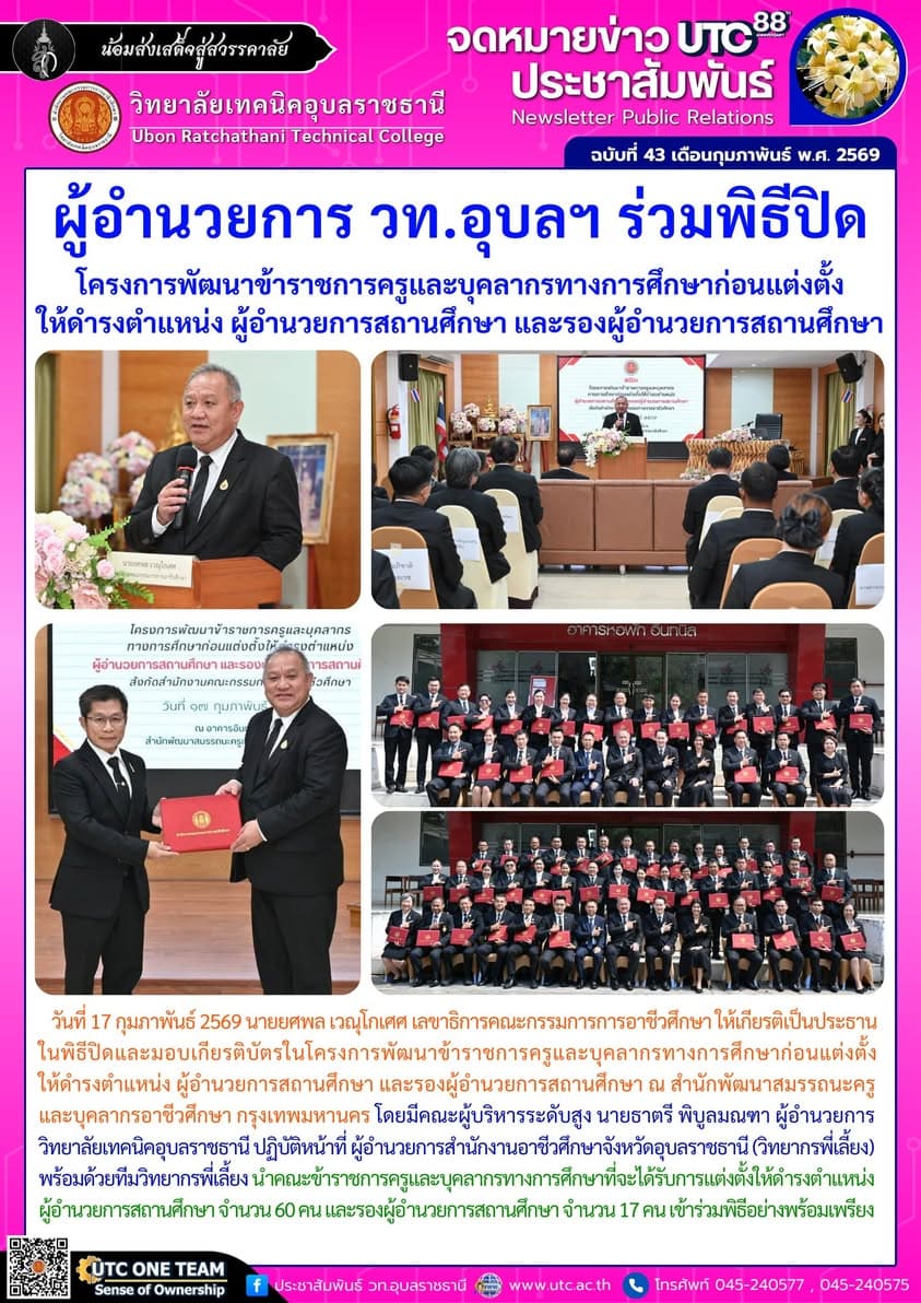 วันที่ 17 กุมภาพันธ์ 2569 นายยศพล เวณุโกเศศ เลขาธิการคณะกรรมการการอาชีวศึกษา ให้เกียรติเป็นประธานในพิธีปิดและมอบเกียรติบัตรในโครงการพัฒนาข้าราชการครูและบุคลากรทางการศึกษาก่อนแต่งตั้งให้ดำรงตำแหน่ง ผู้อำนวยการสถานศึกษา และรองผู้อำนวยการสถานศึกษา ณ สำนักพัฒนาสมรรถนะครูและบุคลากรอาชีวศึกษา กรุงเทพมหานคร โดยมีคณะผู้บริหารระดับสูง นายธาตรี พิบูลมณฑา ผู้อำนวยการวิทยาลัยเทคนิคอุบลราชธานี ปฏิบัติหน้าที่ ผู้อำนวยการสำนักงานอาชีวศึกษาจังหวัดอุบลราชธานี (วิทยากรพี่เลี้ยง) พร้อมด้วยทีมวิทยากรพี่เลี้ยง นำคณะข้าราชการครูและบุคลากรทางการศึกษาที่จะได้รับการแต่งตั้งให้ดำรงตำแหน่ง ผู้อำนวยการสถานศึกษา จำนวน 60 คน และรองผู้อำนวยการสถานศึกษา จำนวน 17 คน เข้าร่วมพิธีอย่างพร้อมเพรียง