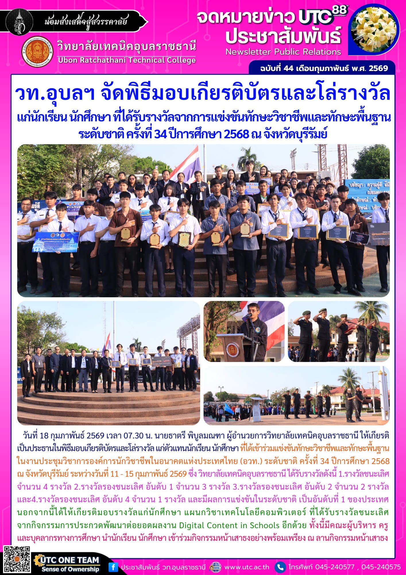 วันที่ 18 กุมภาพันธ์ 2569 เวลา 07.30 น. นายธาตรี พิบูลมณฑา ผู้อำนวยการวิทยาลัยเทคนิคอุบลราชธานี ให้เกียรติเป็นประธานในพิธีมอบเกียรติบัตรและโล่รางวัล แก่ตัวแทนนักเรียน นักศึกษา ที่ได้เข้าร่วมแข่งขันทักษะวิชาชีพและทักษะพื้นฐาน ในงานประชุมวิชาการองค์การนักวิชาชีพในอนาคตแห่งประเทศไทย (อวท.) ระดับชาติ ครั้งที่ 34 ปีการศึกษา 2568 ณ จังหวัดบุรีรัมย์ ระหว่างวันที่ 11 – 15 กุมภาพันธ์ 2569 ซึ่ง วิทยาลัยเทคนิคอุบลราชธานี ได้รับรางวัลดังนี้ 1.รางวัลชนะเลิศ จำนวน 4 รางวัล 2.รางวัลรองชนะเลิศ อันดับ 1 จำนวน 3 รางวัล 3.รางวัลรองชนะเลิศ อันดับ 2 จำนวน 2 รางวัล 4.รางวัลรองชนะเลิศ อันดับ 4 จำนวน 1 รางวัล และมีผลการแข่งขัน ในระดับชาติ เป็นอันดับที่ 1 ของประเทศ นอกจากนี้ได้ให้เกียรติมอบรางวัลแก่นักศึกษา แผนกวิชาเทคโนโลยีคอมพิวเตอร์ ที่ได้รับรางวัลจากกิจกรรมการประกวดพัฒนาต่อยอดผลงาน Digital Content in Schools อีกด้วย ทั้งนี้มีคณะผู้บริหาร ครู และบุคลากรทางการศึกษา นำนักเรียน นักศึกษา เข้าร่วมกิจกรรมหน้าเสาธงอย่างพร้อมเพรียง ณ ลานกิจกรรมหน้าเสาธง