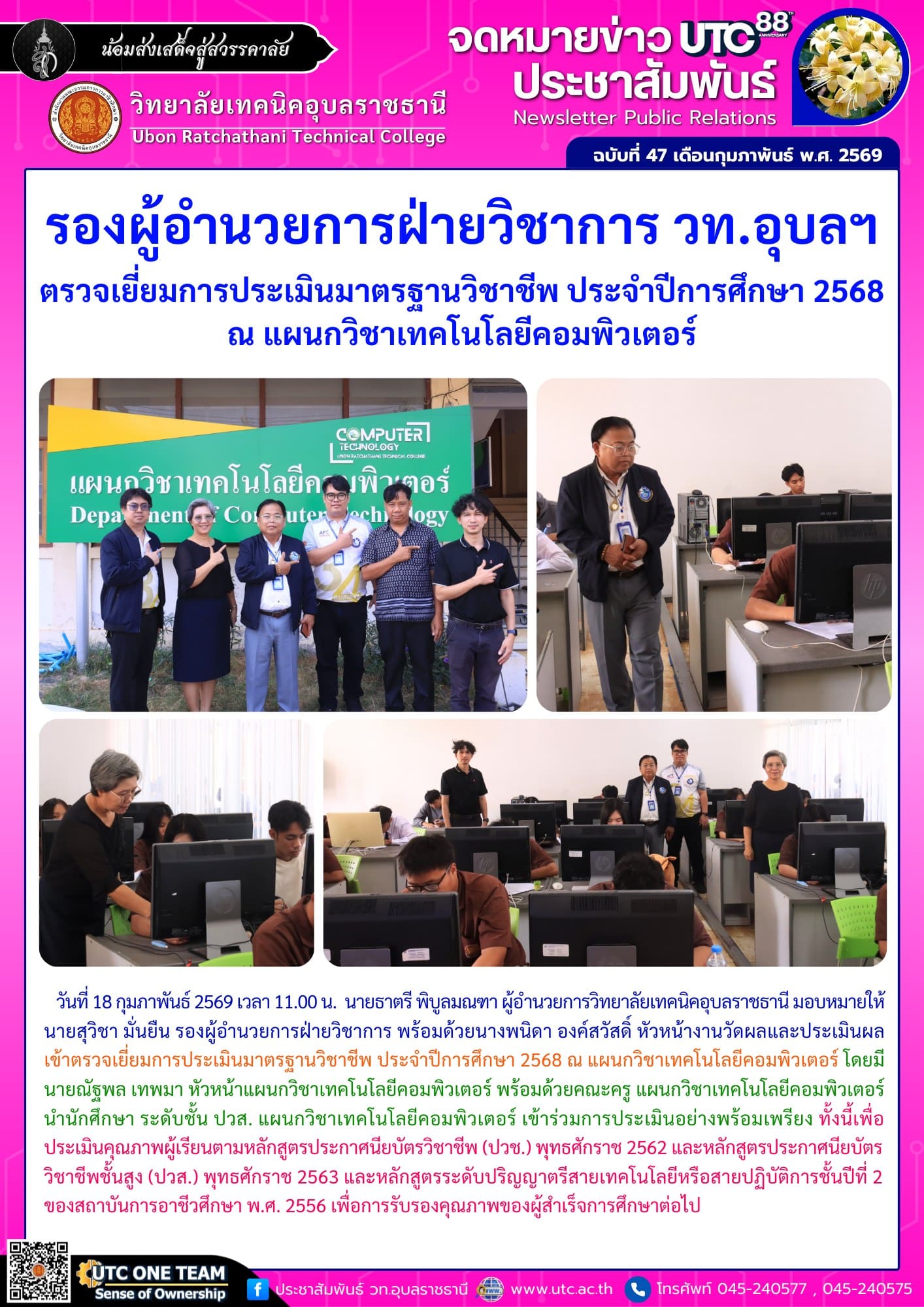 วันที่ 18 กุมภาพันธ์ 2569 เวลา 11.00 น. นายธาตรี พิบูลมณฑา ผู้อำนวยการวิทยาลัยเทคนิคอุบลราชธานี มอบหมายให้ นายสุวิชา มั่นยืน รองผู้อำนวยการฝ่ายวิชาการ พร้อมด้วยนางพนิดา องค์สวัสดิ์ หัวหน้างานวัดผลและประเมินผล เข้าตรวจเยี่ยมการประเมินมาตรฐานวิชาชีพ ประจำปีการศึกษา 2568 ณ แผนกวิชาเทคโนโลยีคอมพิวเตอร์ โดยมี นายณัฐพล เทพมา หัวหน้าแผนกวิชาเทคโนโลยีคอมพิวเตอร์ พร้อมด้วยคณะครู แผนกวิชาเทคโนโลยีคอมพิวเตอร์ นำนักศึกษา ระดับชั้น ปวส. แผนกวิชาเทคโนโลยีคอมพิวเตอร์ เข้าร่วมการประเมินอย่างพร้อมเพรียง ทั้งนี้เพื่อประเมินคุณภาพผู้เรียนตามหลักสูตรประกาศนียบัตรวิชาชีพ (ปวช.) พุทธศักราช 2562 และหลักสูตรประกาศนียบัตรวิชาชีพชั้นสูง (ปวส.) พุทธศักราช 2563 และหลักสูตรระดับปริญญาตรีสายเทคโนโลยีหรือสายปฏิบัติการชั้นปีที่ 2 ของสถาบันการอาชีวศึกษา พ.ศ. 2556 เพื่อการรับรองคุณภาพของผู้สำเร็จการศึกษาต่อไป