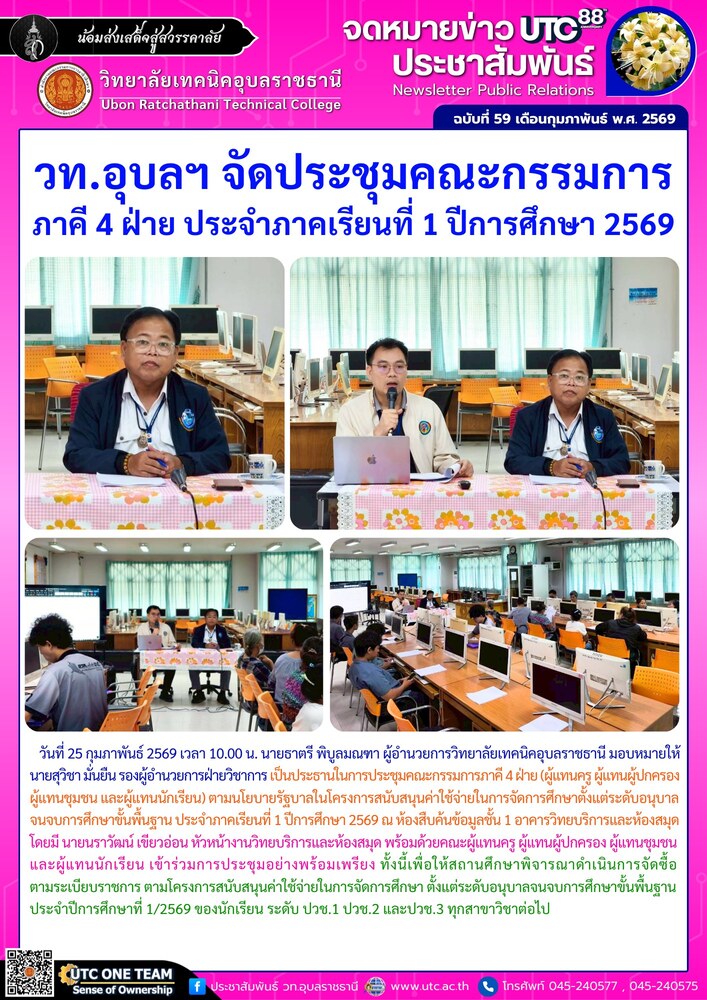 วันที่ 25 กุมภาพันธ์ 2569 เวลา 10.00 น. นายธาตรี พิบูลมณฑา ผู้อำนวยการวิทยาลัยเทคนิคอุบลราชธานี มอบหมายให้ นายสุวิชา มั่นยืน รองผู้อำนวยการฝ่ายวิชาการ เป็นประธานในการประชุมคณะกรรมการภาคี 4 ฝ่าย (ผู้แทนครู ผู้แทนผู้ปกครอง ผู้แทนชุมชน และผู้แทนนักเรียน) ตามนโยบายรัฐบาลในโครงการสนับสนุนค่าใช้จ่ายในการจัดการศึกษาตั้งแต่ระดับอนุบาลจนจบการศึกษาขั้นพื้นฐาน ประจำภาคเรียนที่ 1 ปีการศึกษา 2569 ณ ห้องสืบค้นข้อมูลชั้น 1 อาคารวิทยบริการและห้องสมุด โดยมี นายนราวัฒน์ เขียวอ่อน หัวหน้างานวิทยบริการและห้องสมุด พร้อมด้วยคณะผู้แทนครู ผู้แทนผู้ปกครอง ผู้แทนชุมชน และผู้แทนนักเรียน เข้าร่วมการประชุมอย่างพร้อมเพรียง ทั้งนี้เพื่อให้สถานศึกษาพิจารณาดำเนินการจัดซื้อตามระเบียบราชการ ตามโครงการสนับสนุนค่าใช้จ่ายในการจัดการศึกษา ตั้งแต่ระดับอนุบาลจนจบการศึกษาขั้นพื้นฐาน ประจำปีการศึกษาที่ 1/2569 ของนักเรียน ระดับ ปวช.1 ปวช.2 และปวช.3 ทุกสาขาวิชาต่อไป