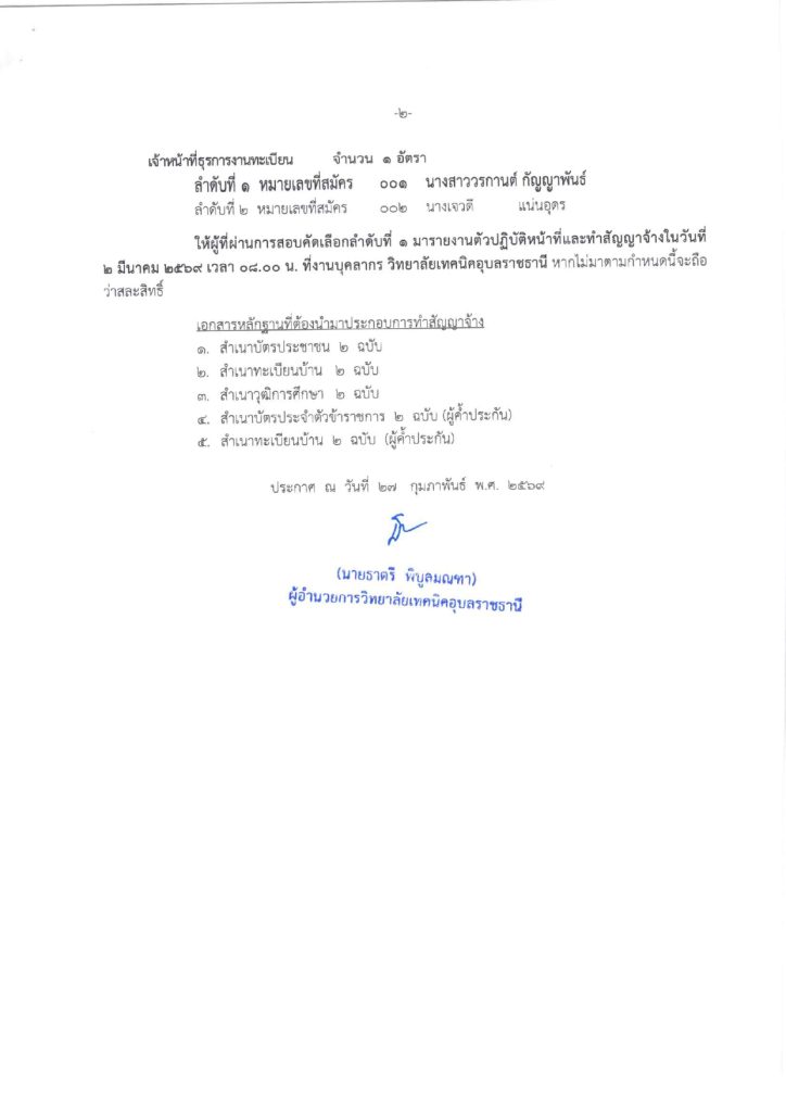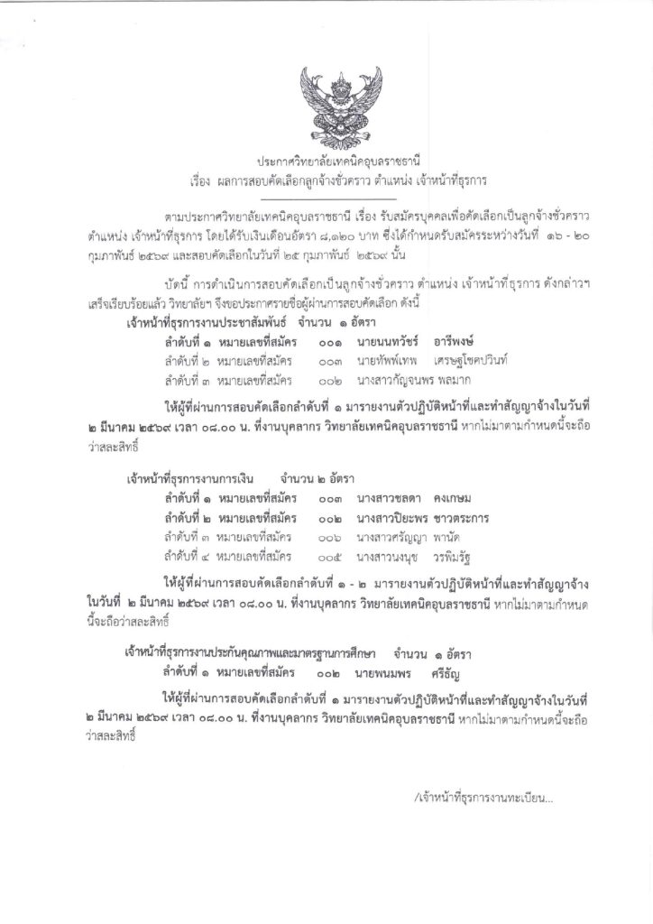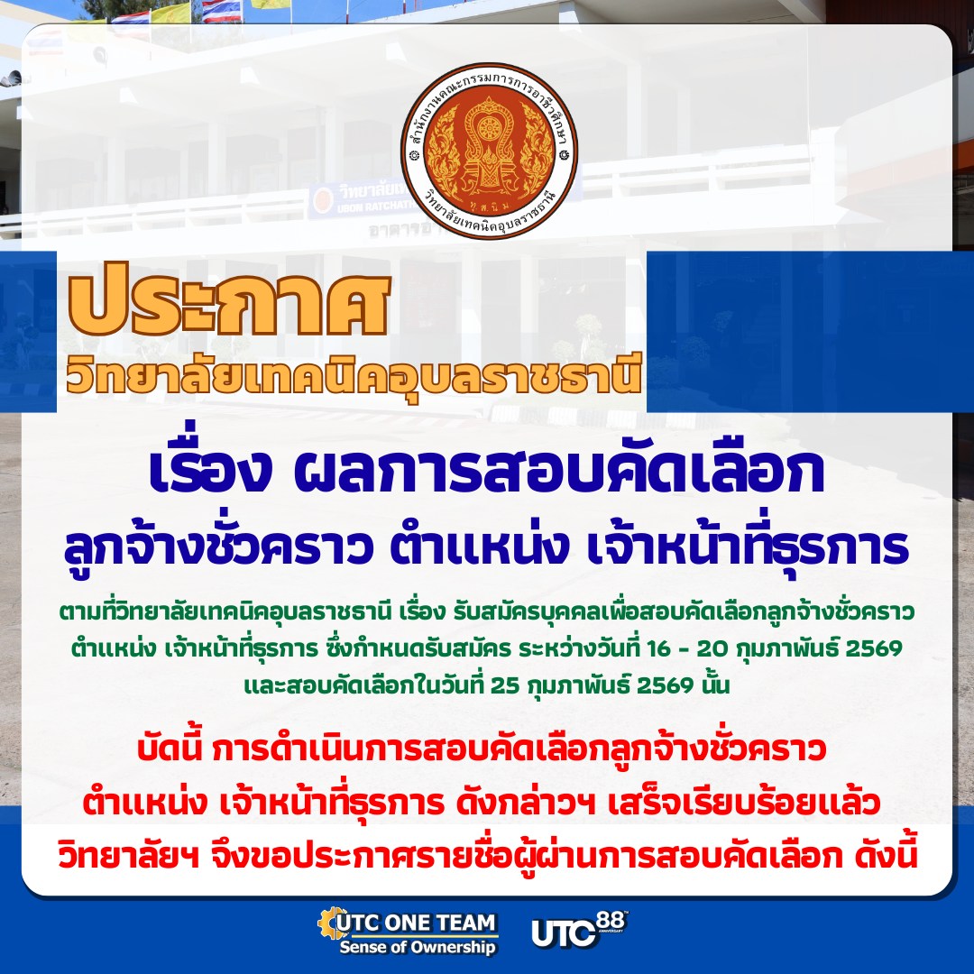 ตามที่วิทยาลัยเทคนิคอุบลราชธานี เรื่อง รับสมัครบุคคลเพื่อสอบคัดเลือกลูกจ้างชั่วคราว ตำแหน่ง เจ้าหน้าที่ธุรการ ซึ่งกำหนดรับสมัคร ระหว่างวันที่ 16 – 20 กุมภาพันธ์ 2569 และสอบคัดเลือกในวันที่ 25 กุมภาพันธ์ 2569 นั้น