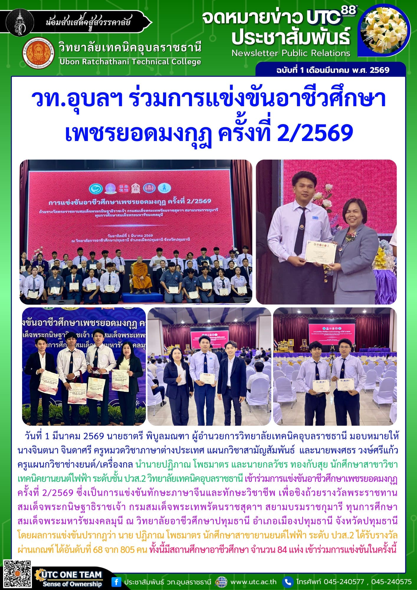 วันที่ 1 มีนาคม 2569 นายธาตรี พิบูลมณฑา ผู้อำนวยการวิทยาลัยเทคนิคอุบลราชธานี มอบหมายให้ นางจินตนา จินดาศรี ครูหมวดวิชาภาษาต่างประเทศ แผนกวิชาสามัญสัมพันธ์ และนายพงศธร วงษ์ศรีแก้ว ครูแผนกวิชาช่างยนต์/เครื่องกล นำนายปฏิภาณ โพธมาตร และนายกลวัชร ทองกับสุย นักศึกษาสาขาวิชาเทคนิคยานยนต์ไฟฟ้า ระดับชั้น ปวส.2 วิทยาลัยเทคนิคอุบลราชธานี เข้าร่วมการแข่งขันอาชีวศึกษาเพชรยอดมงกุฎ ครั้งที่ 2/2569 ซึ่งเป็นการแข่งขันทักษะภาษาจีนและทักษะวิชาชีพ เพื่อชิงถ้วยรางวัลพระราชทานสมเด็จพระกนิษฐาธิราชเจ้า กรมสมเด็จพระเทพรัตนราชสุดาฯ สยามบรมราชกุมารี ทุนการศึกษาสมเด็จพระมหารัชมงคลมุนี ณ วิทยาลัยอาชีวศึกษาปทุมธานี อำเภอเมืองปทุมธานี จังหวัดปทุมธานี โดยผลการแข่งขันปรากฎว่า นาย ปฏิภาณ โพธมาตร นักศึกษาสาขายานยนต์ไฟฟ้า ระดับ ปวส 2 ได้รับรางวัลผ่านเกณฑ์ ได้อันดับที่ 68 จาก 805 คน ทั้งนี้มีสถานศึกษาอาชีวศึกษา จำนวน 84 แห่ง เข้าร่วมการแข่งขันในครั้งนี้