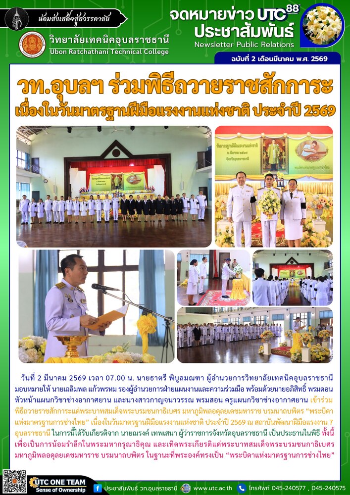 วันที่ 2 มีนาคม 2569 เวลา 07.00 น. นายธาตรี พิบูลมณฑา ผู้อำนวยการวิทยาลัยเทคนิคอุบลราชธานี มอบหมายให้ นายเฉลิมพล แก้วพรหม รองผู้อำนวยการฝ่ายแผนงานและความร่วมมือ พร้อมด้วยนายอภิสิทธิ์ พรมดอน หัวหน้าแผนกวิชาช่างอากาศยาน และนางสาวกาญจนาวรรณ พรมสอน ครูแผนกวิชาช่างอากาศยาน เข้าร่วมพิธีถวายราชสักการะแด่พระบาทสมเด็จพระบรมชนกาธิเบศร มหาภูมิพลอดุลยเดชมหาราช บรมนาถบพิตร “พระบิดาแห่งมาตรฐานการช่างไทย” เนื่องในวันมาตรฐานฝีมือแรงงานแห่งชาติ ประจำปี 2569 ณ สถาบันพัฒนาฝีมือแรงงาน 7 อุบลราชธานี ในการนี้ได้รับเกียรติจาก นายณรงค์ เทพเสนา ผู้ว่าราชการจังหวัดอุบลราชธานี เป็นประธานในพิธี ทั้งนี้เพื่อเป็นการน้อมรำลึกในพระมหากรุณาธิคุณ และเทิดพระเกียรติแด่พระบาทสมเด็จพระบรมชนกาธิเบศร มหาภูมิพลอดุลยเดชมหาราช บรมนาถบพิตร ในฐานะที่พระองค์ทรงเป็น “พระบิดาแห่งมาตรฐานการช่างไทย”