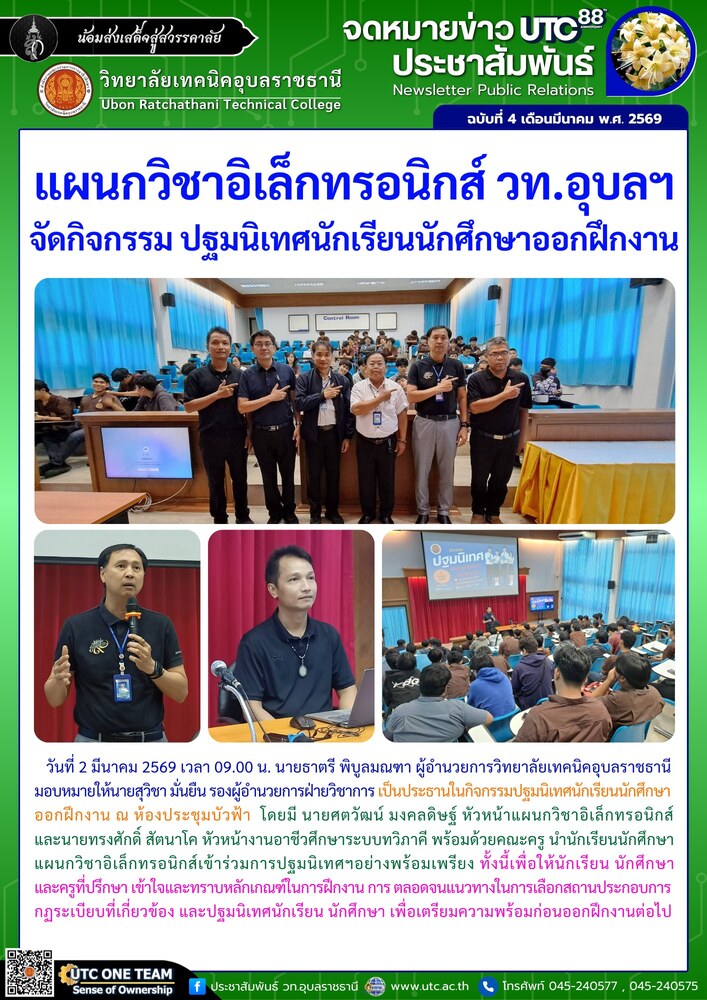 วันที่ 2 มีนาคม 2569 เวลา 09.00 น. นายธาตรี พิบูลมณฑา ผู้อำนวยการวิทยาลัยเทคนิคอุบลราชธานี มอบหมายให้นายสุวิชา มั่นยืน รองผู้อำนวยการฝ่ายวิชาการ เป็นประธานในกิจกรรมปฐมนิเทศนักเรียนนักศึกษาออกฝึกงาน ณ ห้องประชุมบัวฟ้า โดยมี นายศตวัฒน์ มงคลดิษฐ์ หัวหน้าแผนกวิชาอิเล็กทรอนิกส์ และนายทรงศักดิ์ สัตนาโค หัวหน้างานอาชีวศึกษาระบบทวิภาคี พร้อมด้วยคณะครู นำนักเรียนนักศึกษา แผนกวิชาอิเล็กทรอนิกส์เข้าร่วมการปฐมนิเทศฯอย่างพร้อมเพรียง ทั้งนี้เพื่อให้นักเรียน นักศึกษา และครูที่ปรึกษา เข้าใจและทราบหลักเกณฑ์ในการฝึกงาน การ ตลอดจนแนวทางในการเลือกสถานประกอบการ กฏระเบียบที่เกี่ยวข้อง และปฐมนิเทศนักเรียน นักศึกษา เพื่อเตรียมความพร้อมก่อนออกฝึกงานต่อไป