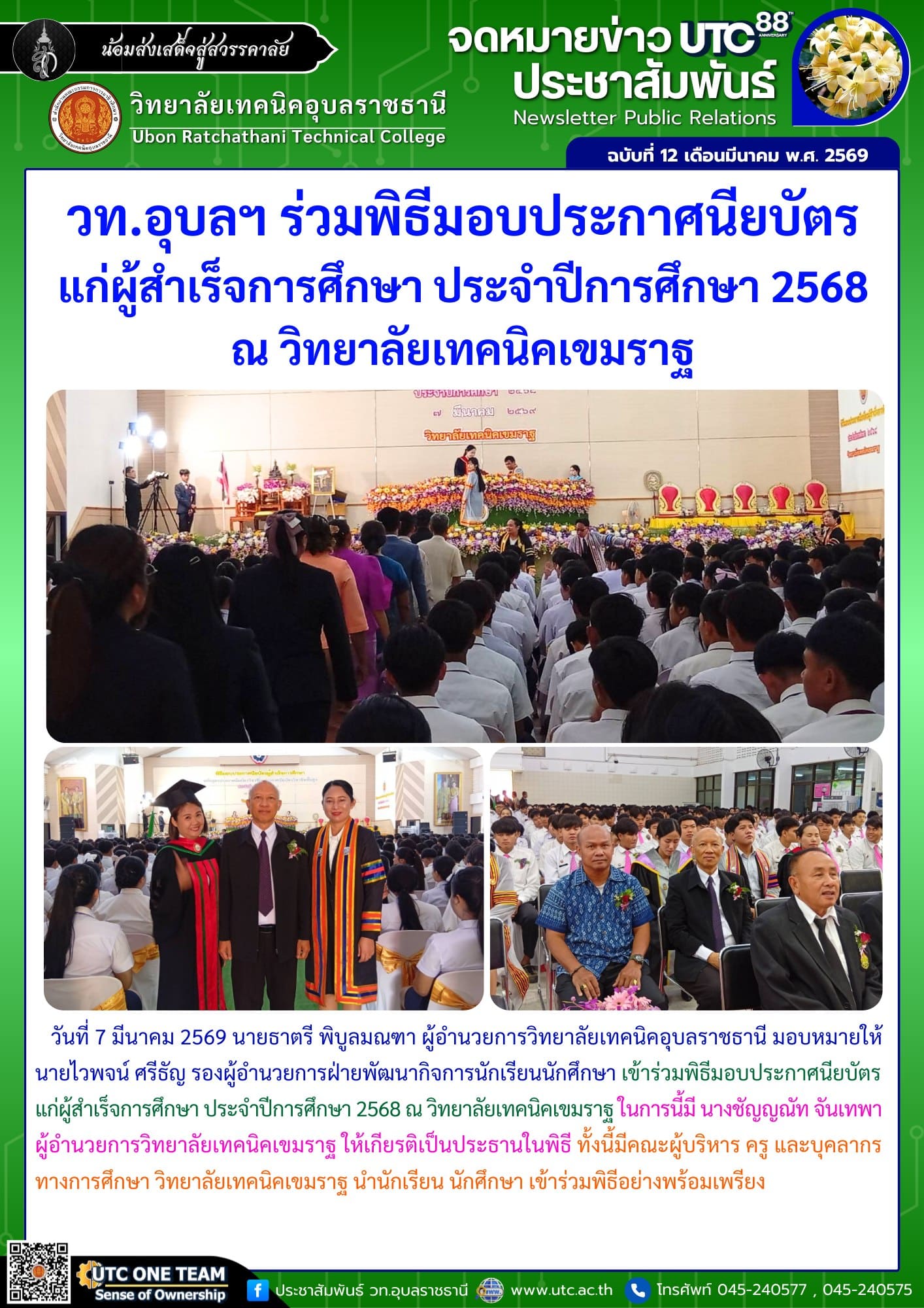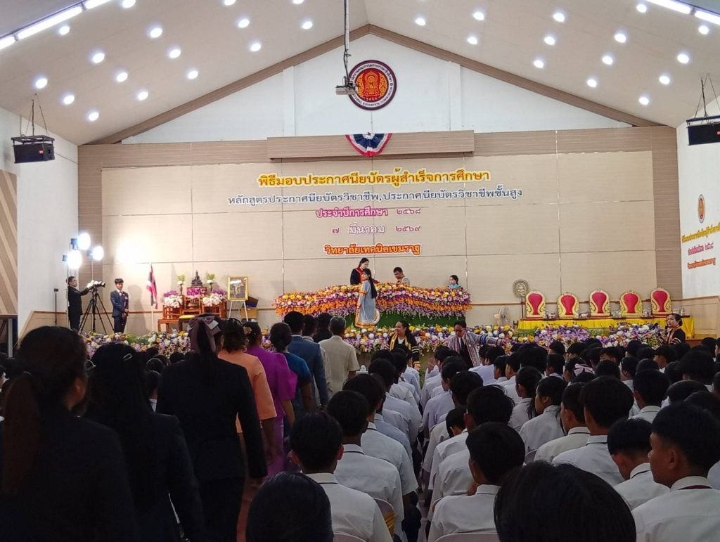 วันที่ 7 มีนาคม 2569 นายธาตรี พิบูลมณฑา ผู้อำนวยการวิทยาลัยเทคนิคอุบลราชธานี มอบหมายให้ นายไวพจน์ ศรีธัญ รองผู้อำนวยการฝ่ายพัฒนากิจการนักเรียนนักศึกษา เข้าร่วมพิธีมอบประกาศนียบัตรแก่ผู้สำเร็จการศึกษา ประจำปีการศึกษา 2568 ณ วิทยาลัยเทคนิคเขมราฐ ในการนี้มี นางชัญญณัท จันเทพา ผู้อำนวยการวิทยาลัยเทคนิคเขมราฐ ให้เกียรติเป็นประธานในพิธี ทั้งนี้มีคณะผู้บริหาร ครู และบุคลากรทางการศึกษา วิทยาลัยเทคนิคเขมราฐ นำนักเรียน นักศึกษา เข้าร่วมพิธีอย่างพร้อมเพรียง