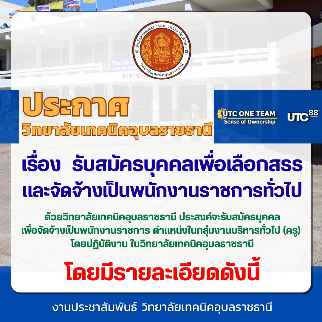 ด้วยวิทยาลัยเทคนิคอุบลราชธานี ประสงค์จะรับสมัครบุคคลเพื่อจัดจ้างเป็นพนักงานราชการ ตำแหน่งในกลุ่มงานบริหารทั่วไป (ครู) โดยปฏิบัติงาน ในวิทยาลัยเทคนิคอุบลราชธานี
