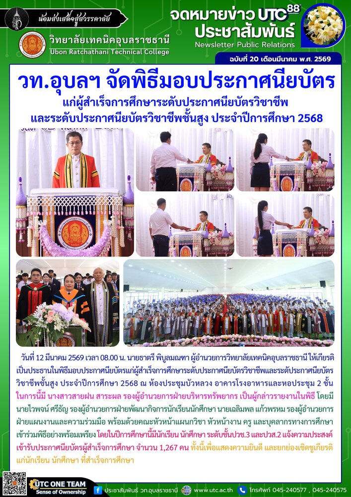 วันที่ 12 มีนาคม 2569 เวลา 08.00 น. นายธาตรี พิบูลมณฑา ผู้อำนวยการวิทยาลัยเทคนิคอุบลราชธานี ให้เกียรติเป็นประธานในพิธีมอบประกาศนียบัตรแก่ผู้สำเร็จการศึกษาระดับประกาศนียบัตรวิชาชีพ และระดับประกาศนียบัตรวิชาชีพชั้นสูง ประจำปีการศึกษา 2568 ณ ห้องประชุมบัวหลวง อาคารโรงอาหารและหอประชุม 2 ชั้น ในการนี้มี นางสาวสายฝน สาระผล รองผู้อำนวยการฝ่ายบริหารทรัพยากร เป็นผู้กล่าวรายงานในพิธี โดยมี นายไวพจน์ ศรีธัญ รองผู้อำนวยการฝ่ายพัฒนากิจการนักเรียนนักศึกษา นายเฉลิมพล แก้วพรหม รองผู้อำนวยการฝ่ายแผนงานและความร่วมมือ พร้อมด้วยคณะหัวหน้าแผนกวิชา หัวหน้างาน ครู และบุคลากรทางการศึกษา เข้าร่วมพิธีอย่างพร้อมเพรียง โดยในปีการศึกษานี้มีนักเรียน นักศึกษา ระดับชั้นปวช.3 และปวส.2 แจ้งความประสงค์เข้ารับประกาศนียบัตรผู้สำเร็จการศึกษา จำนวน 1,267 คน ทั้งนี้เพื่อแสดงความยินดี และยกย่องเชิดชูเกียรติแก่นักเรียน นักศึกษา ที่สำเร็จการศึกษา