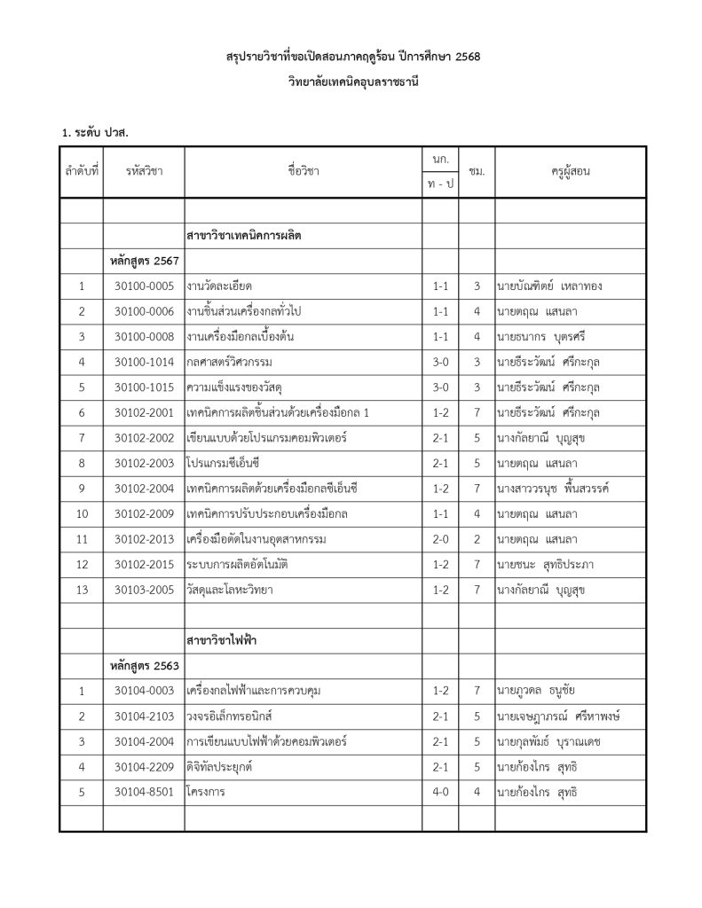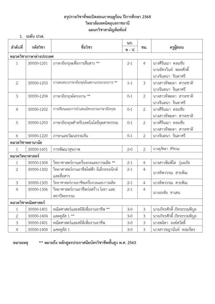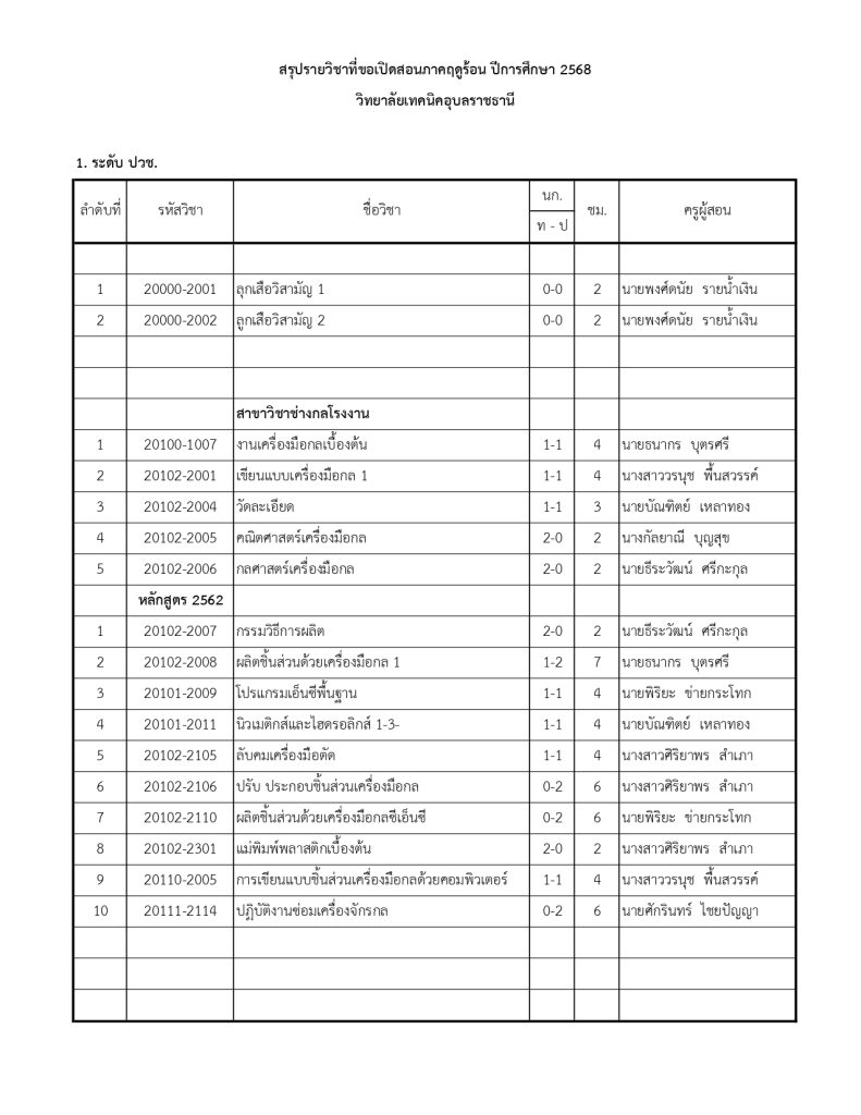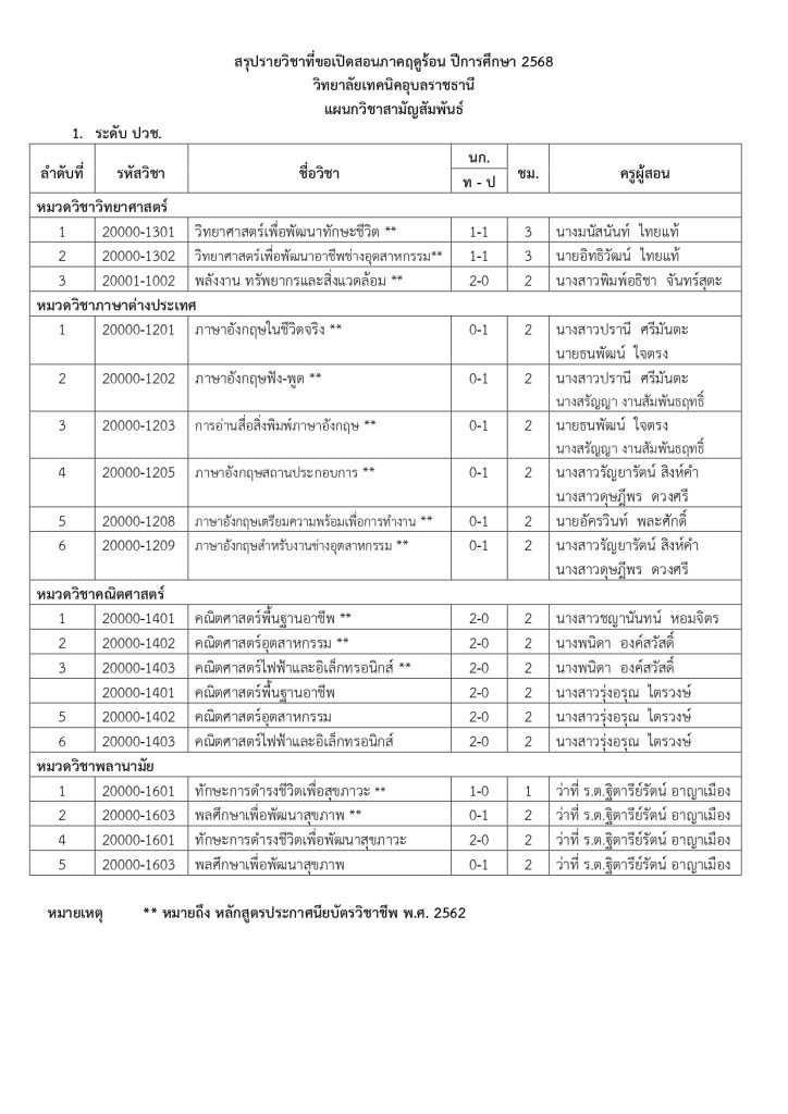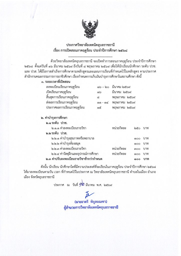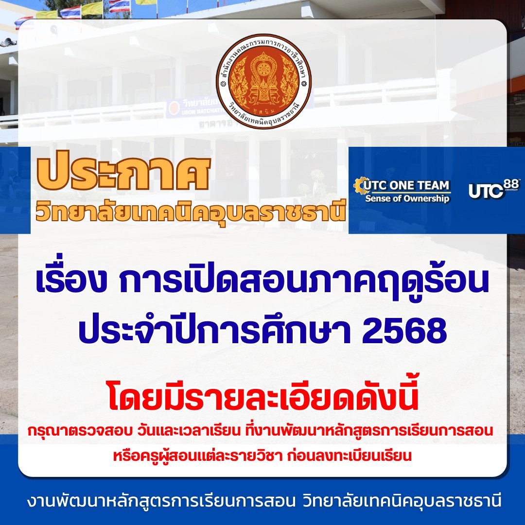 ประกาศวิทยาลัยเทคนิคอุบลราชธานี เรื่อง การเปิดสอนภาคฤดูร้อน ประจำปีการศึกษา 2568