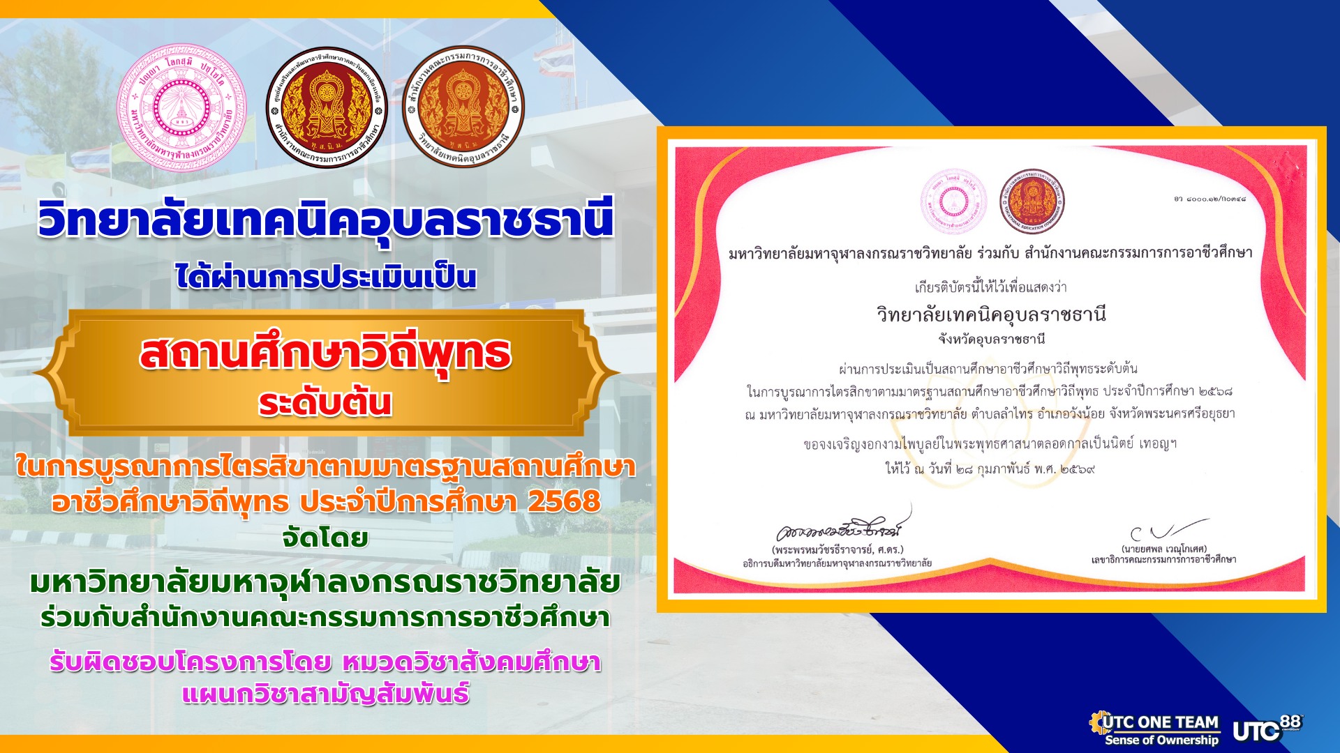 วิทยาลัยเทคนิคอุบลราชธานี ได้ผ่านการประเมินเป็น สถานศึกษาวิถีพุทธ ระดับต้น