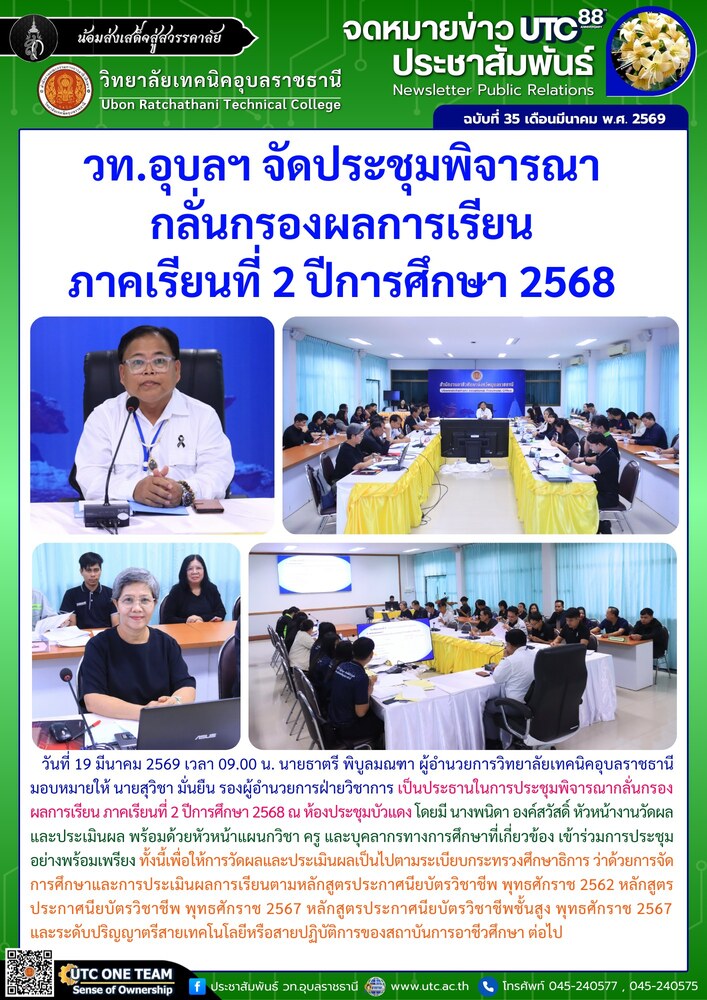 วันที่ 19 มีนาคม 2569 เวลา 09.00 น. นายธาตรี พิบูลมณฑา ผู้อำนวยการวิทยาลัยเทคนิคอุบลราชธานี มอบหมายให้ นายสุวิชา มั่นยืน รองผู้อำนวยการฝ่ายวิชาการ เป็นประธานในการประชุมพิจารณากลั่นกรองผลการเรียน ภาคเรียนที่ 2 ปีการศึกษา 2568 ณ ห้องประชุมบัวแดง โดยมี นางพนิดา องค์สวัสดิ์ หัวหน้างานวัดผลและประเมินผล พร้อมด้วยหัวหน้าแผนกวิชา ครู และบุคลากรทางการศึกษาที่เกี่ยวข้อง เข้าร่วมการประชุมอย่างพร้อมเพรียง ทั้งนี้เพื่อให้การวัดผลและประเมินผลเป็นไปตามระเบียบกระทรวงศึกษาธิการ ว่าด้วยการจัดการศึกษาและการประเมินผลการเรียนตามหลักสูตรประกาศนียบัตรวิชาชีพ พุทธศักราช 2562 หลักสูตรประกาศนียบัตรวิชาชีพ พุทธศักราช 2567 หลักสูตรประกาศนียบัตรวิชาชีพชั้นสูง พุทธศักราช 2567 และระดับปริญญาตรีสายเทคโนโลยีหรือสายปฏิบัติการของสถาบันการอาชีวศึกษา ต่อไป