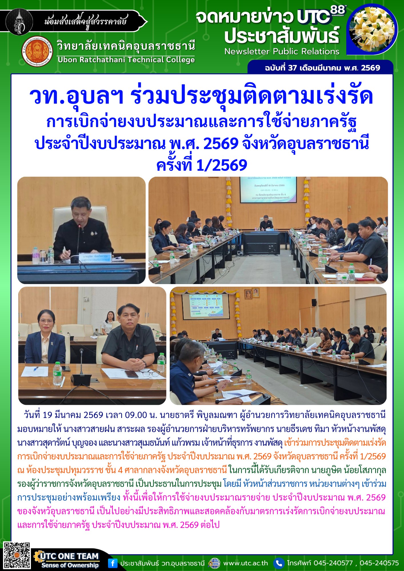 วันที่ 19 มีนาคม 2569 เวลา 09.00 น. นายธาตรี พิบูลมณฑา ผู้อำนวยการวิทยาลัยเทคนิคอุบลราชธานี มอบหมายให้ นางสาวสายฝน สาระผล รองผู้อำนวยการฝ่ายบริหารทรัพยากรและรองผู้อำนวยการฝ่ายแผนงานและความร่วมมือ นายธีรเดช ทิมา หัวหน้างานพัสดุ นางสาวสุดารัตน์ บุญจอง และนางสาวสุเมธนันท์ แก้วพรม เจ้าหน้าที่ธุรการ งานพัสดุ เข้าร่วมการประชุมติดตามเร่งรัดการเบิกจ่ายงบประมาณและการใช้จ่ายภาครัฐ ประจำปีงบประมาณ พ.ศ. 2569 จังหวัดอุบลราชธานี ครั้งที่ 1/2569 ณ ห้องประชุมปทุมวรราช ชั้น 4 ศาลากลางจังหวัดอุบลราชธานี ในการนี้ได้รับเกียรติจาก นายภูษิต น้อยโสภากุล รองผู้ว่าราชการจังหวัดอุบลราชธานี เป็นประธานในการประชุม โดยมี หัวหน้าส่วนราชการ หน่วยงานต่างๆ เข้าร่วมการประชุมอย่างพร้อมเพรียง ทั้งนี้เพื่อให้การใช้จ่ายงบประมาณรายจ่าย ประจำปีงบประมาณ พ.ศ. 2569 ของจังหวัอุบลราชธานี เป็นไปอย่างมีประสิทธิภาพและสอดคล้องกับมาตรการเร่งรัดการเบิกจ่ายงบประมาณและการใช้จ่ายภาครัฐ ประจำปีงบประมาณ พ.ศ. 2569 ต่อไป