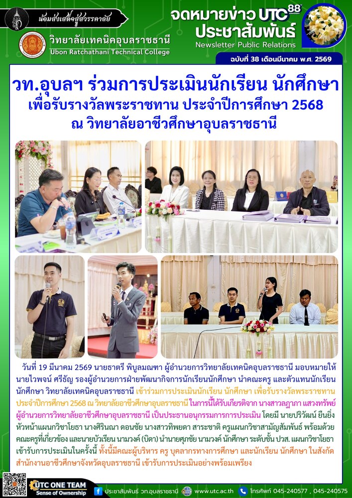 วันที่ 19 มีนาคม 2569 นายธาตรี พิบูลมณฑา ผู้อำนวยการวิทยาลัยเทคนิคอุบลราชธานี มอบหมายให้ นายไวพจน์ ศรีธัญ รองผู้อำนวยการฝ่ายพัฒนากิจการนักเรียนนักศึกษา นำคณะครู และตัวแทนนักเรียน นักศึกษา วิทยาลัยเทคนิคอุบลราชธานี เข้าร่วมการประเมินนักเรียน นักศึกษา เพื่อรับรางวัลพระราชทาน ประจำปีการศึกษา 2568 ณ วิทยาลัยอาชีวศึกษาอุบลราชธานี ในการนี้ได้รับเกียรติจาก นางสาวลฎาภา แสวงทรัพย์ ผู้อำนวยการวิทยาลัยอาชีวศึกษาอุบลราชธานี เป็นประธานอนุกรรมการการประเมิน โดยมี นายปริวัฒน์ ยืนยิ่ง หัวหน้าแผนกวิชาโยธา นางศิรินณา ดอนชัย นางสาวทิพยดา สาระชาติ ครูแผนกวิชาสามัญสัมพันธ์ พร้อมด้วยคณะครูที่เกี่ยวข้อง และนายบัวเรียน นามวงค์ (บิดา) นำนายศุภชัย นามวงค์ นักศึกษา ระดับชั้น ปวส. แผนกวิชาโยธา เข้ารับการประเมินในครั้งนี้ ทั้งนี้มีคณะผู้บริหาร ครู บุคลากรทางการศึกษา และนักเรียน นักศึกษา ในสังกัดสำนักงานอาชีวศึกษาจังหวัดอุบลราชธานี เข้ารับการประเมินอย่างพร้อมเพรียง