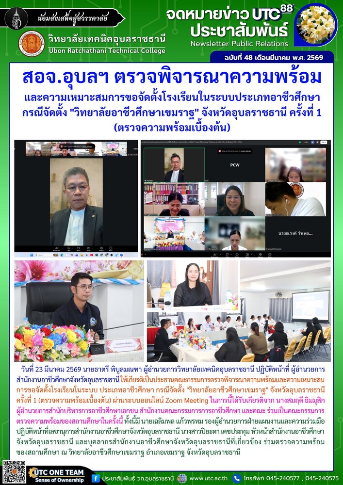 วันที่ 23 มีนาคม 2569 นายธาตรี พิบูลมณฑา ผู้อำนวยการวิทยาลัยเทคนิคอุบลราชธานี ปฏิบัติหน้าที่ ผู้อำนวยการสำนักงานอาชีวศึกษาจังหวัดอุบลราชธานี ให้เกียรติเป็นประธานคณะกรรมการตรวจพิจารณาความพร้อมและความเหมาะสมการขอจัดตั้งโรงเรียนในระบบ ประเภทอาชีวศึกษา กรณีจัดตั้ง “วิทยาลัยอาชีวศึกษาเขมราฐ” จังหวัดอุบลราชธานี ครั้งที่ 1 (ตรวจความพร้อมเบื้องต้น) ผ่านระบบออนไลน์ Zoom Meeting ในการนี้ได้รับเกียรติจาก นางสมฤดี ฉิมมุสิก ผู้อำนวยการสำนักบริหารการอาชีวศึกษาเอกชน สำนักงานคณะกรรมการการอาชีวศึกษา และคณะ ร่วมเป็นคณะกรรมการตรวจความพร้อมของสถานศึกษาในครั้งนี้ ทั้งนี้มี นายเฉลิมพล แก้วพรหม รองผู้อำนวยการฝ่ายแผนงานและความร่วมมือ ปฏิบัติหน้าที่เลขานุการสำนักงานอาชีวศึกษาจังหวัดอุบลราชธานี นางสาวปิยะดา เดชประทุม หัวหน้าสำนักงานอาชีวศึกษาจังหวัดอุบลราชธานี และบุคลากรสำนักงานอาชีวศึกษาจังหวัดอุบลราชธานีที่เกี่ยวข้อง ร่วมตรวจความพร้อมของสถานศึกษา ณ วิทยาลัยอาชีวศึกษาเขมราฐ อำเภอเขมราฐ จังหวัดอุบลราชธานี