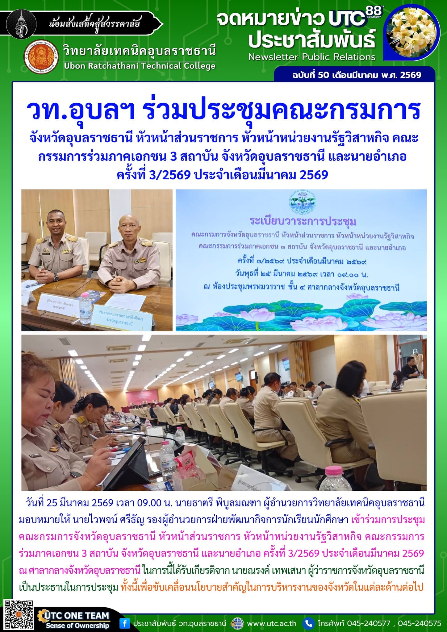 วันที่ 25 มีนาคม 2569เวลา 09.00 น. นายธาตรี พิบูลมณฑา ผู้อำนวยการวิทยาลัยเทคนิคอุบลราชธานี มอบหมายให้ นายไวพจน์ ศรีธัญ รองผู้อำนวยการฝ่ายพัฒนากิจการนักเรียนนักศึกษา เข้าร่วมการประชุมคณะกรมการจังหวัดอุบลราชธานี หัวหน้าส่วนราชการ หัวหน้าหน่วยงานรัฐวิสาหกิจ คณะกรรมการร่วมภาคเอกชน 3 สถาบัน จังหวัดอุบลราชธานี และนายอำเภอ ครั้งที่ 3/2569 ประจำเดือนมีนาคม 2569 ณ ศาลากลางจังหวัดอุบลราชธานี ในการนี้ได้รับเกียรติจาก นายณรงค์ เทพเสนา ผู้ว่าราชการจังหวัดอุบลราชธานี เป็นประธานในการประชุม ทั้งนี้เพื่อขับเคลื่อนนโยบายสำคัญในการบริหารงานของจังหวัดในแต่ละด้านต่อไป